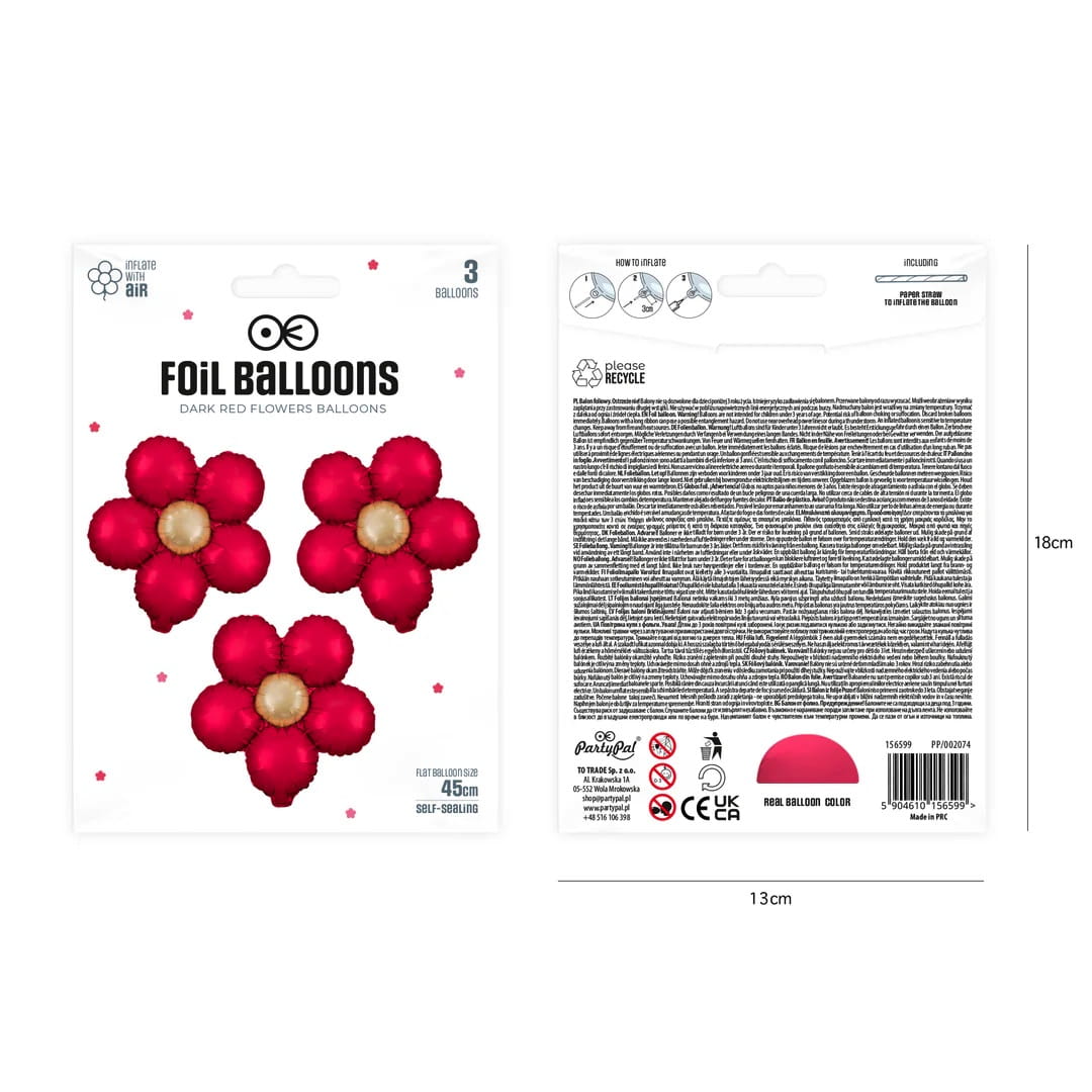 Balony foliowe Kwiat czerwony matowy 45cm 3szt. stokrotki