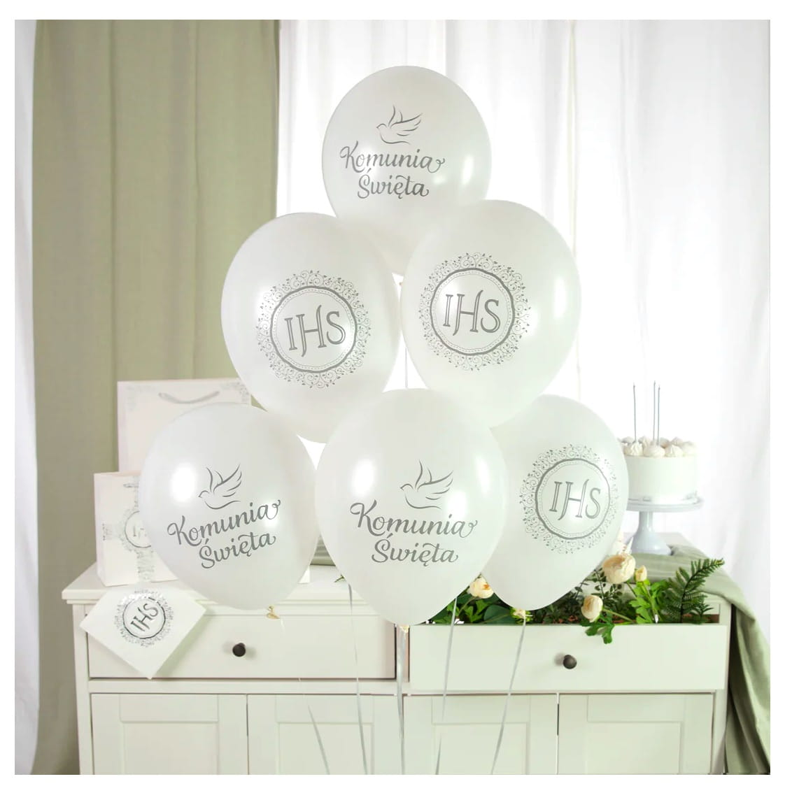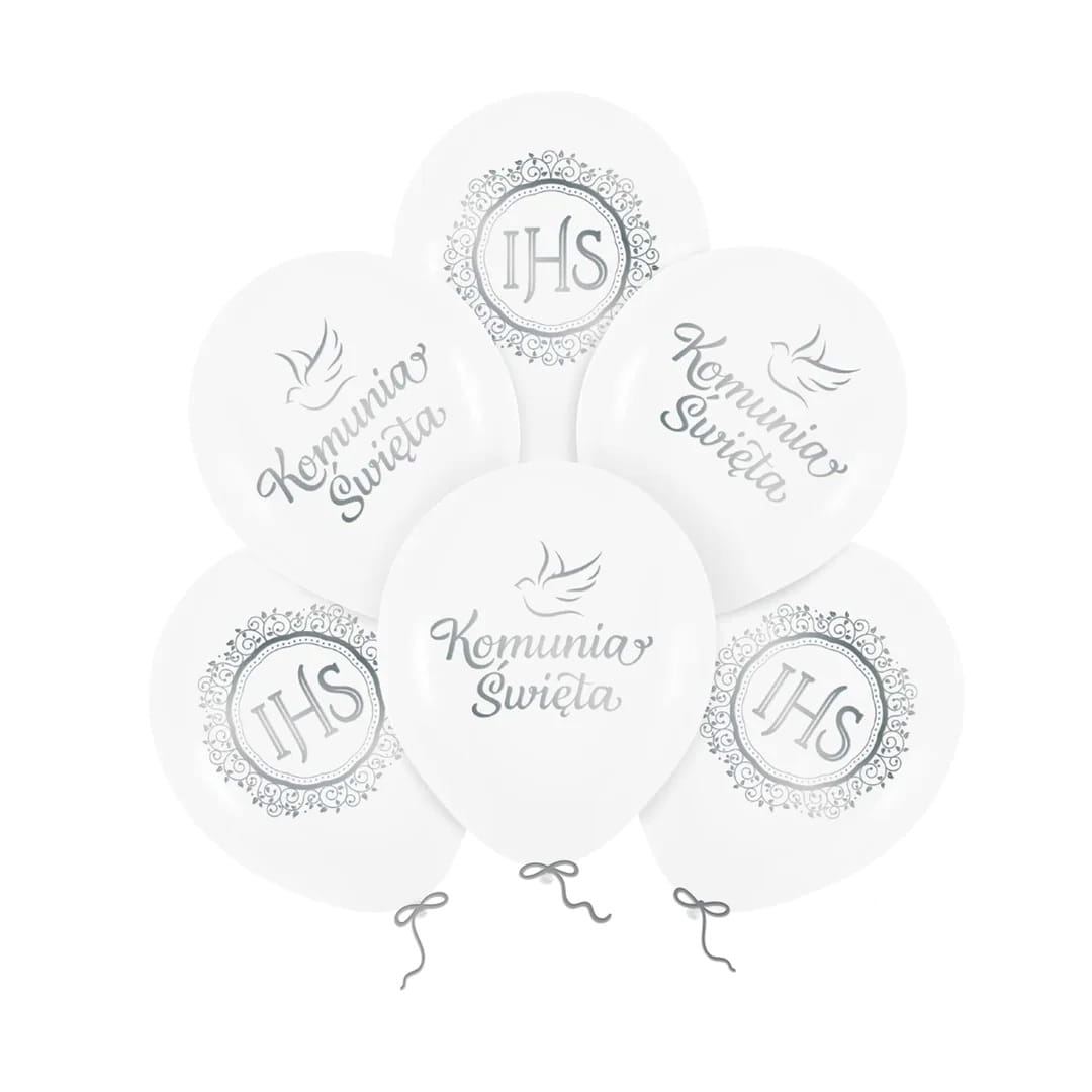 Balony KOMUNIA ŚWIĘTA biało srebrne IHS komunijne Lateksowe 6szt DUŻE