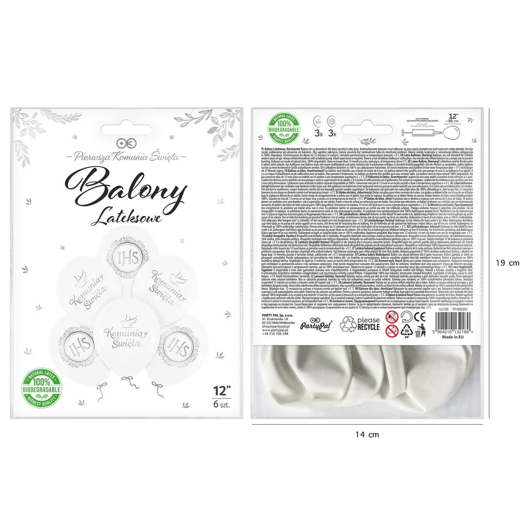 Balony lateksowe Komunia Święta IHS komunijne biodegradowalne biało-srebrne 12cali 6szt
