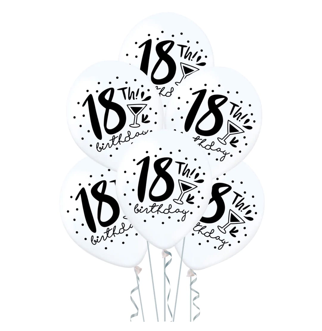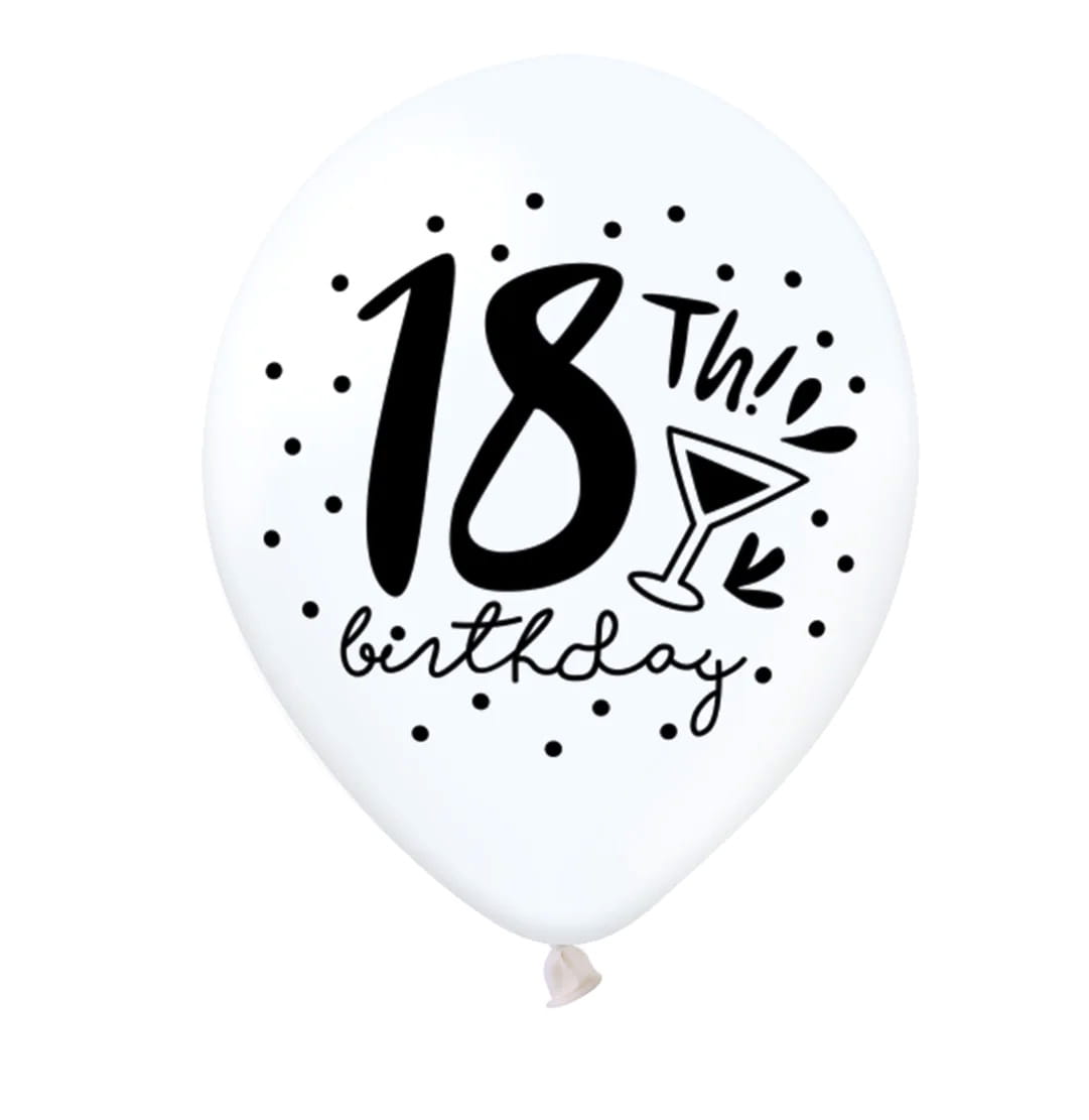 Balony lateksowe białe z nadrukiem na 18stkę Urodziny 12 cali 6 szt
