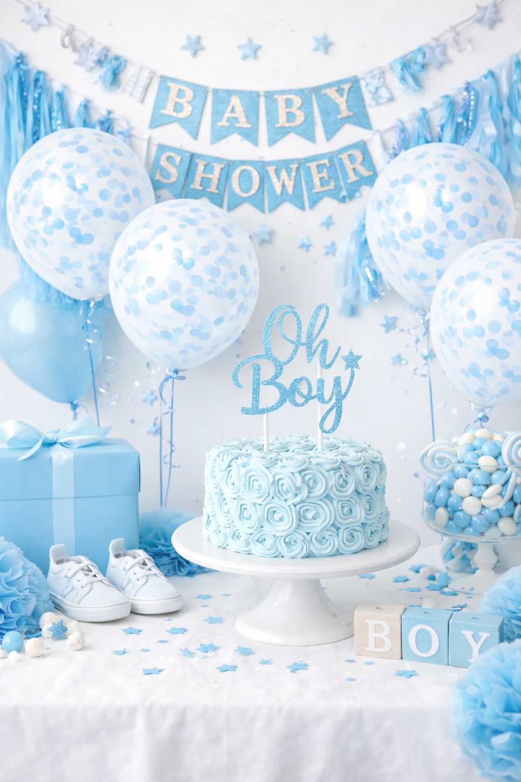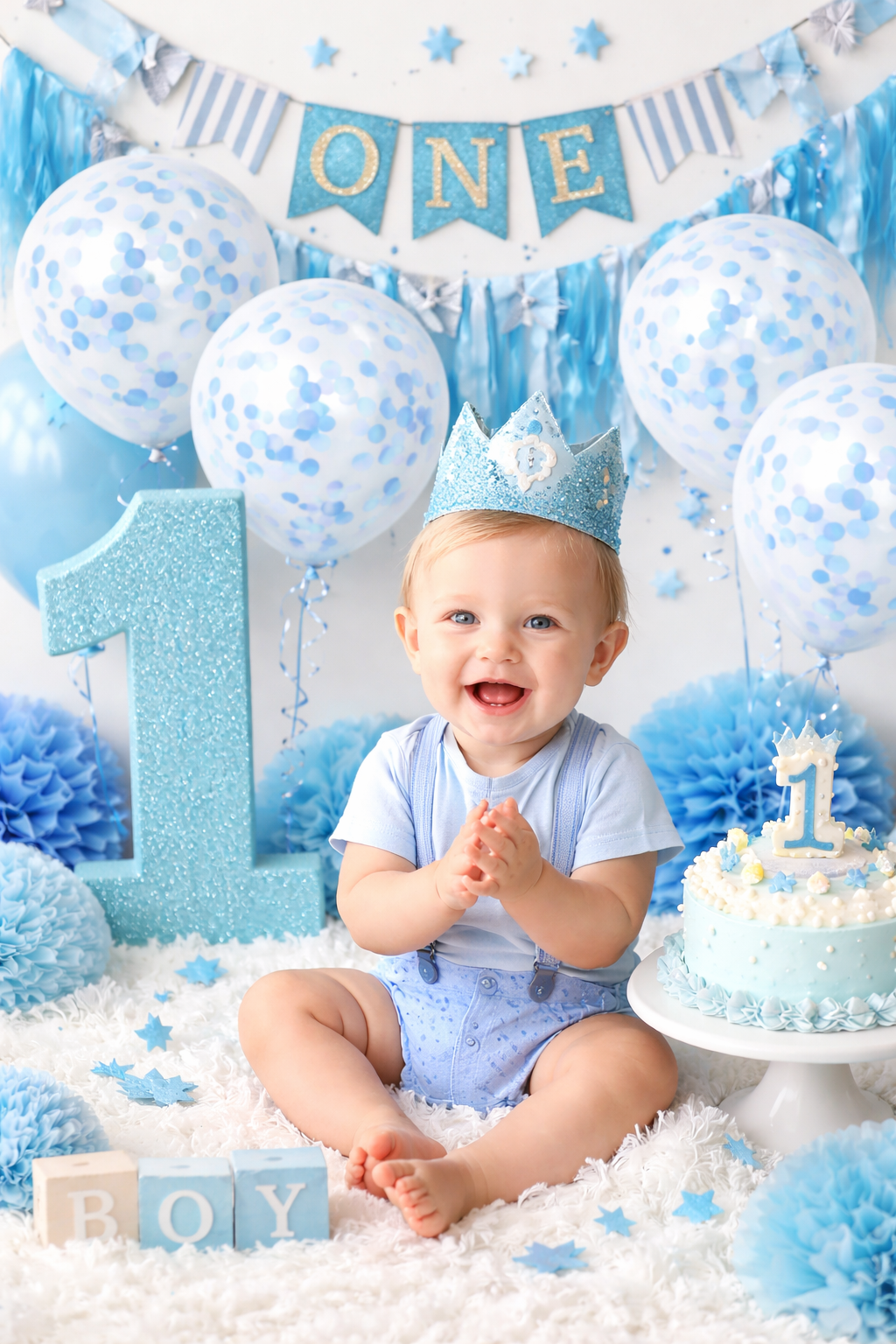 ✔️ Delikatną błękitną kolorystykę idealną na roczek chłopca