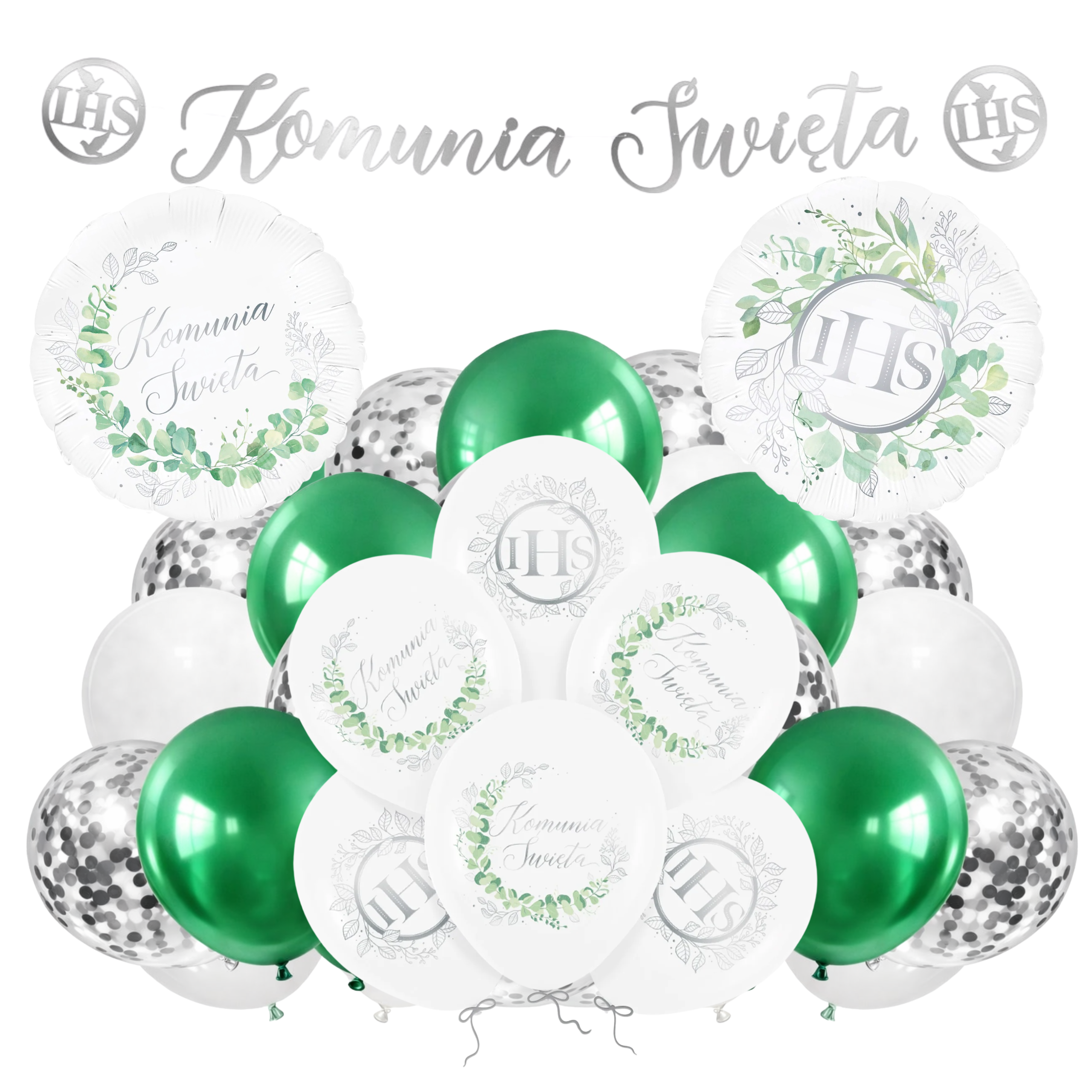 Balony na Komunię Świętą dla chłopca biało zielone Zestaw balonów Girlanda