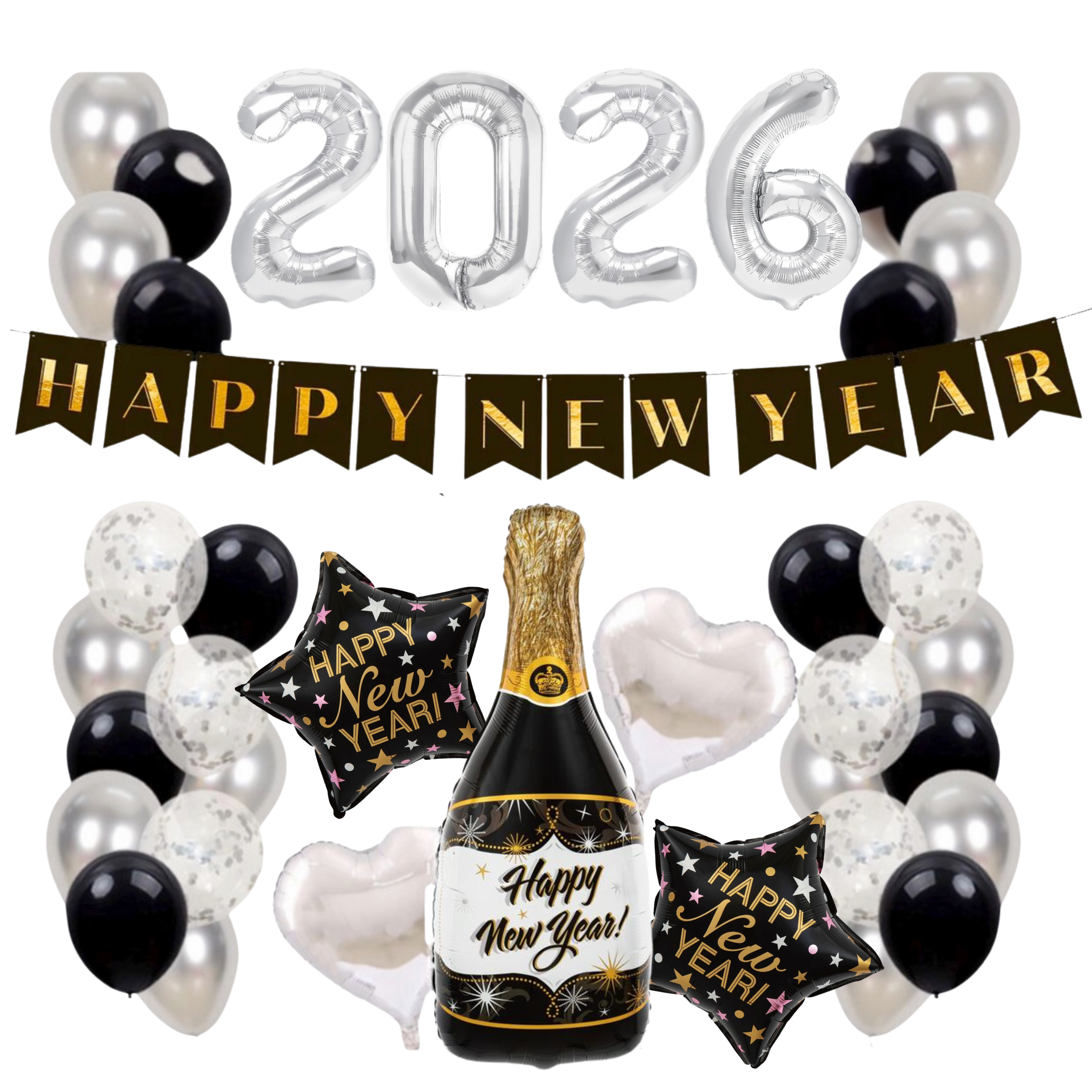 Balony srebrne na Sylwestra Szampan Zestaw balonów srebrne Cyfry 2026 Baner