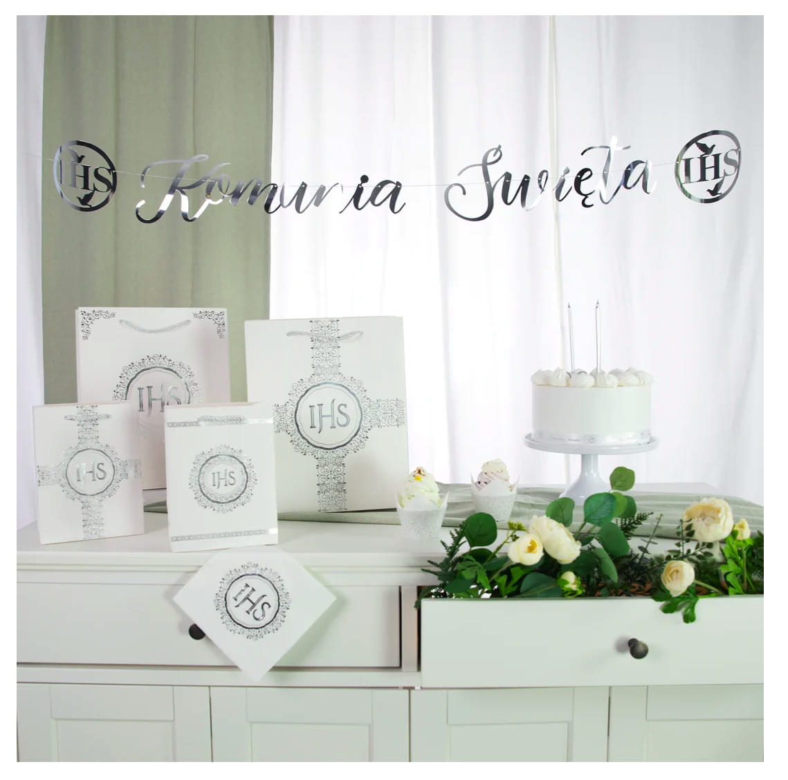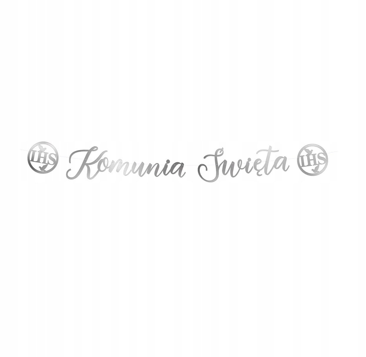 ✔️ girlanda papierowa, jednostronna srebrna Komunia Święta (wymiary: 17x150 cm, długość złotego sznurka: 5m)