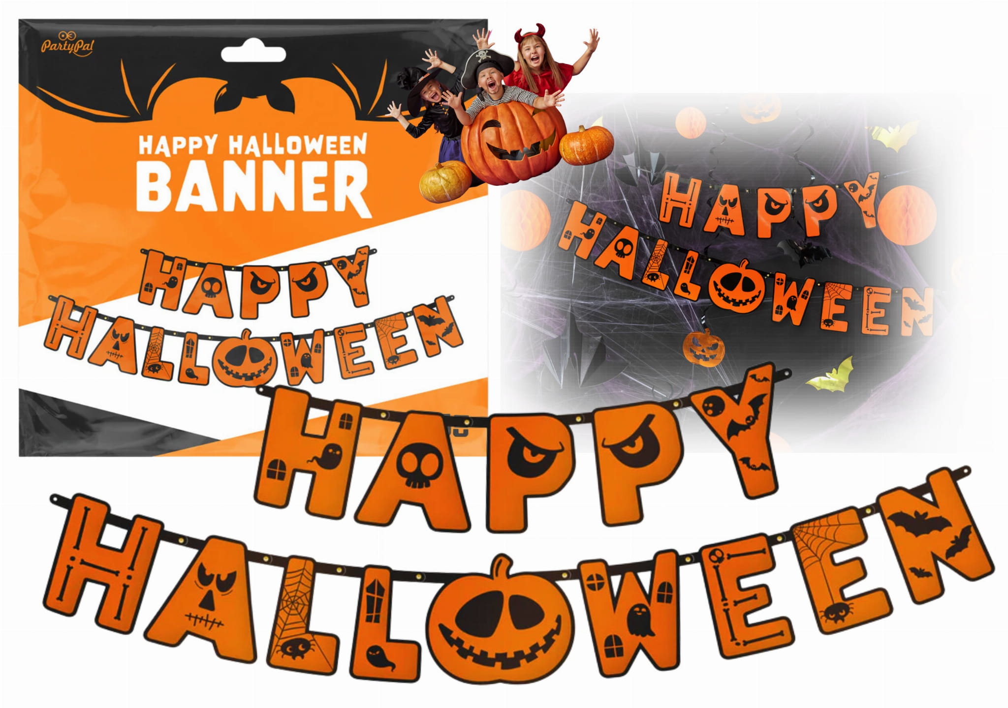 Baner pomarańczowy Happy Halloween Dynie Duszki Pajęczyny Girlanda papierowa