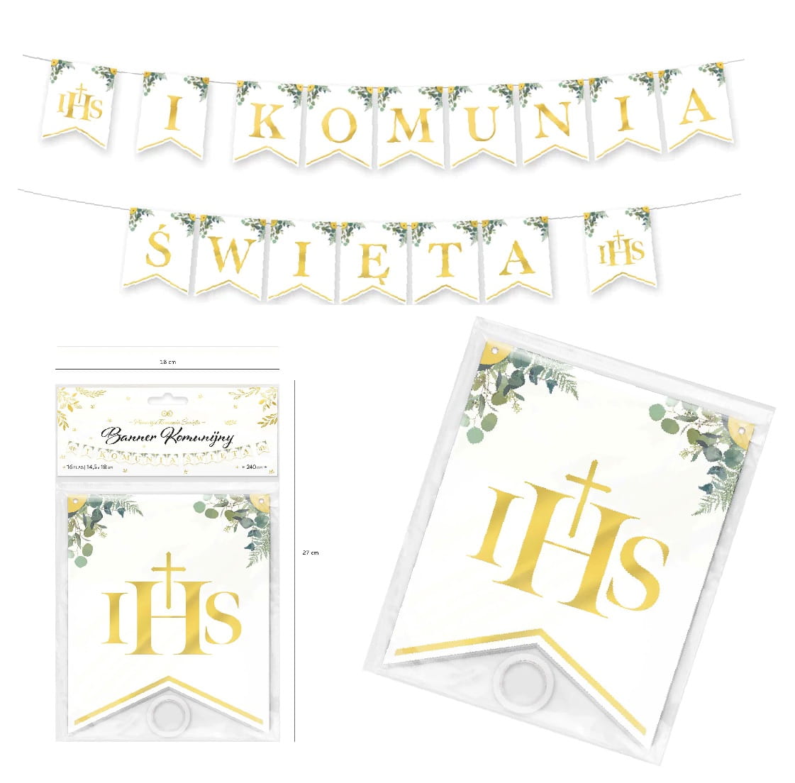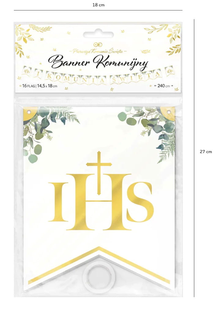 Girlanda IHS I Komunia Święta Baner na Komunię zielone gałązki