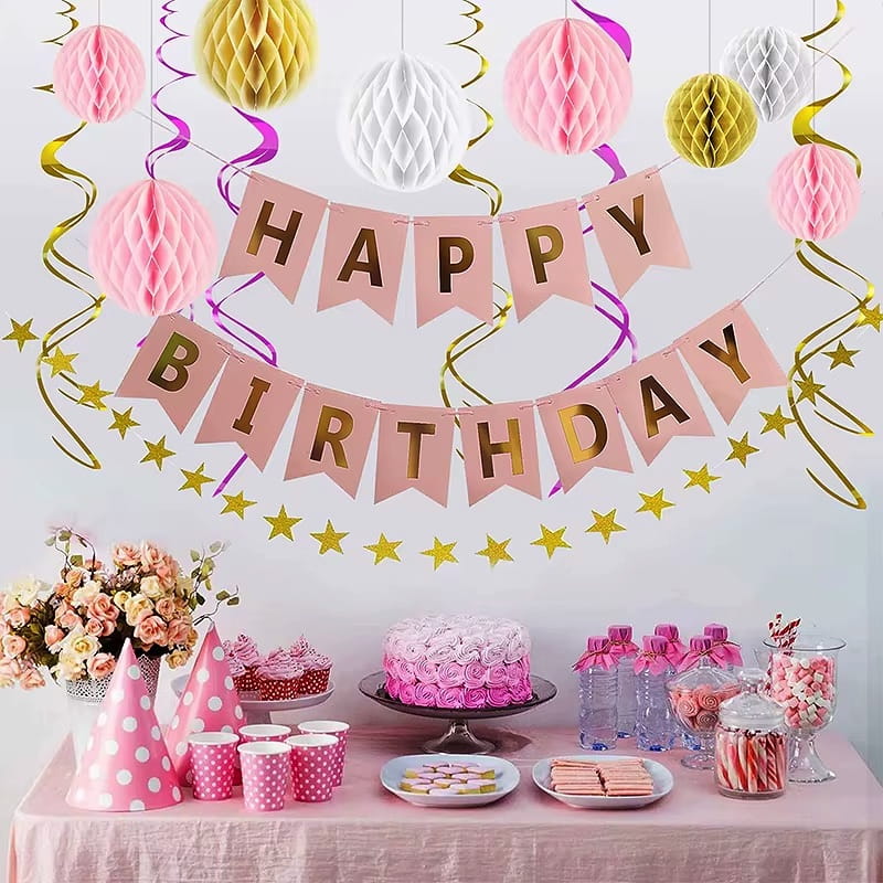 Girlanda Happy Birthday różowo złota Baner papierowy urodzinowy Roczek Dziewczynki