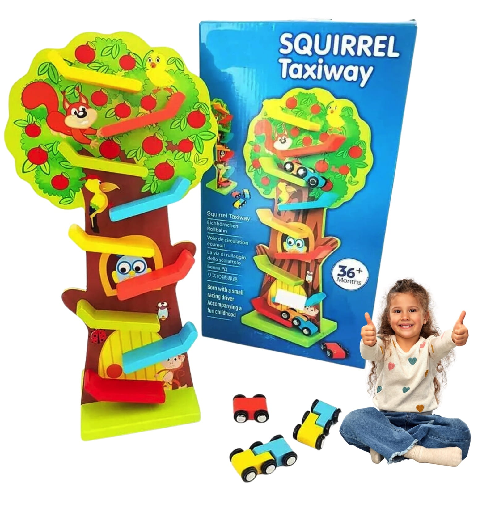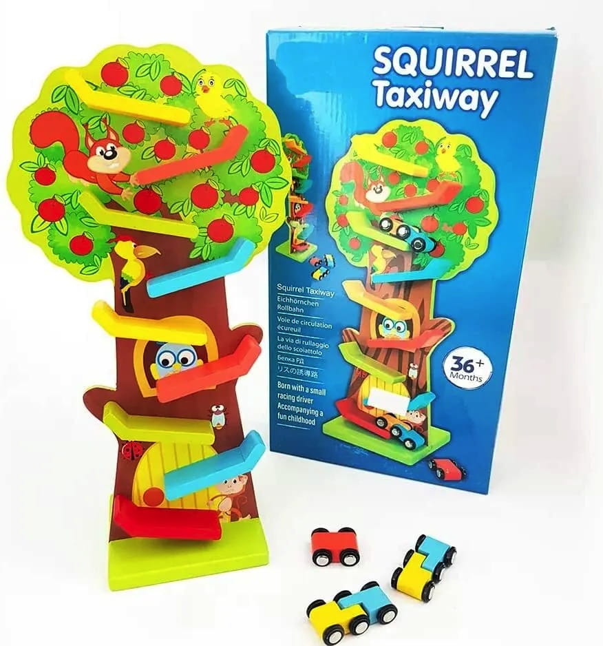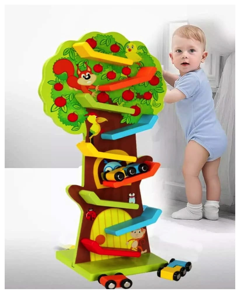 Składa się z 9 kolorowych poziomów zjeżdżalni, które umożliwiają śledzenie ruchu samochodzików, rozwijając jednocześnie koordynację wzrokowo-ruchową i umiejętności motoryczne.