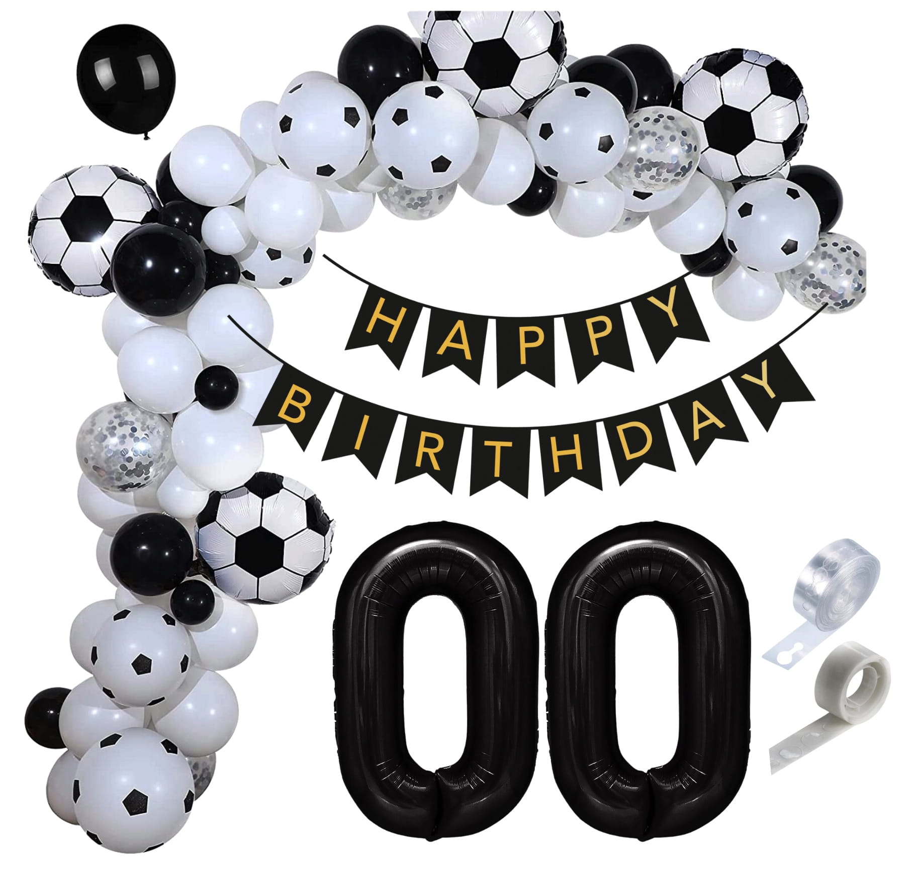 ⚽️ Dołączony baner urodzinowy "Happy Birthday" w eleganckiej kolorystyce złoto-czarnej doskonale komponuje się z balonami, tworząc spójną i stylową dekorację. Taśma do girland i kropki klejowe ułatwią montaż, pozwalając na szybkie i wygodne przygotowanie ozdób.