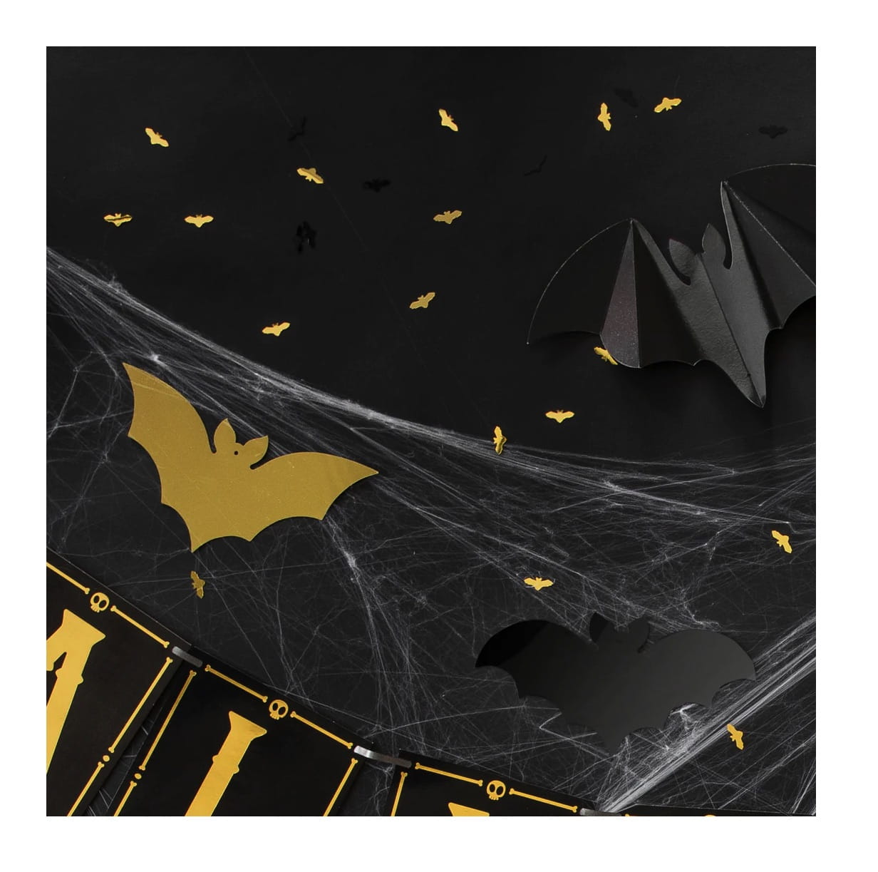 ✔️ baner Happy Halloween (girlanda z 14 flag, czarne flagi ze złotą obwódkę z kości piszczelowych i czaszki na szczycie,14,2x20x250cm)
