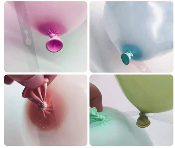 ➡️ Przymocuj balony do taśmy (większe oczko → mniejsze).