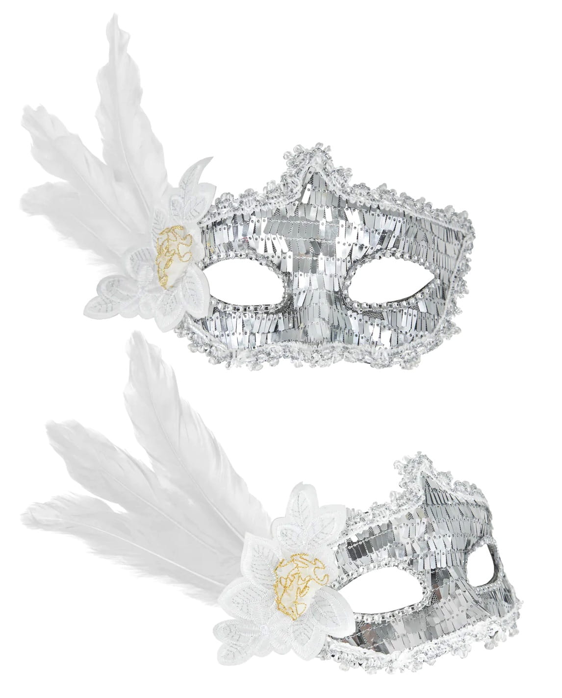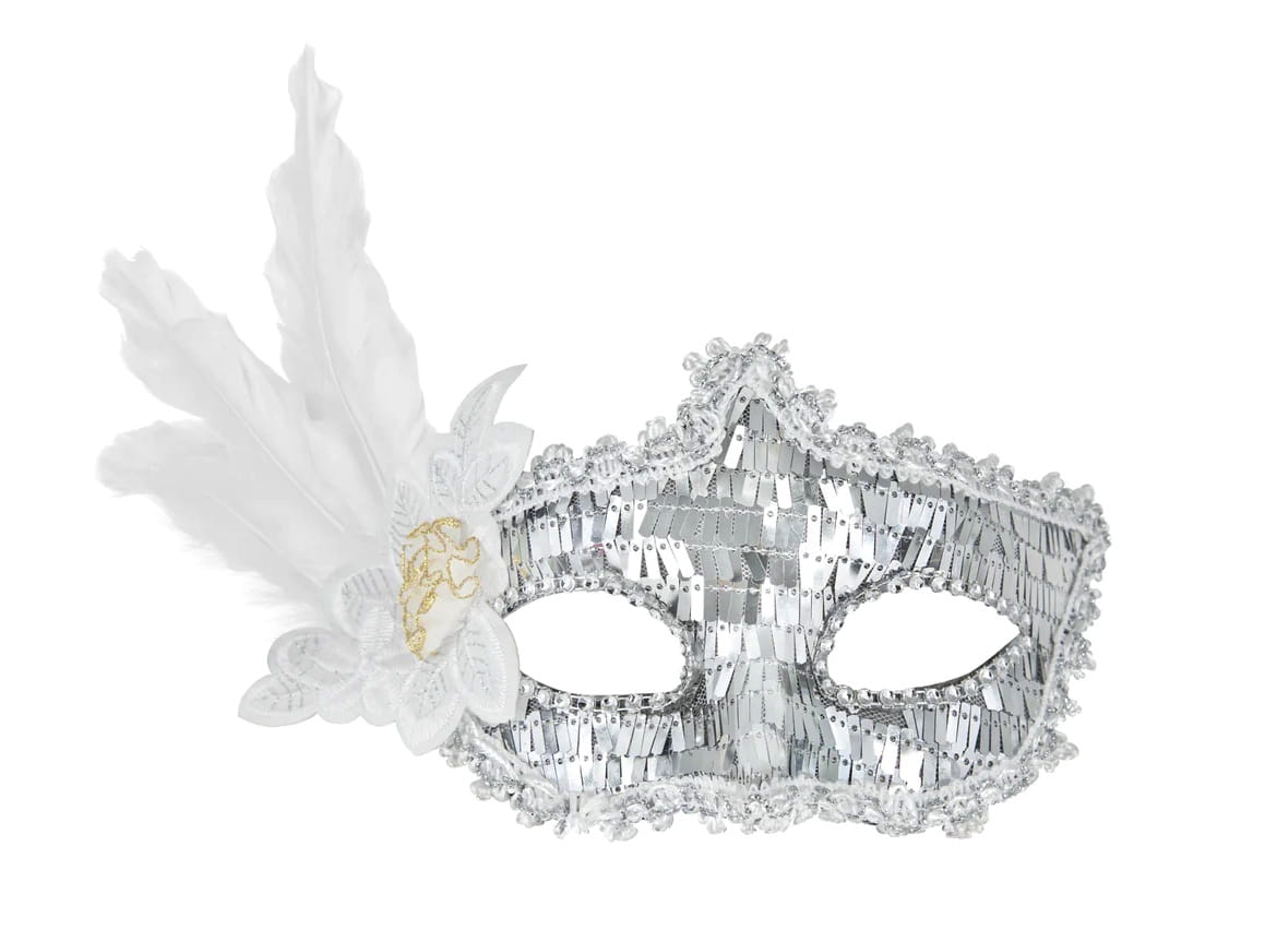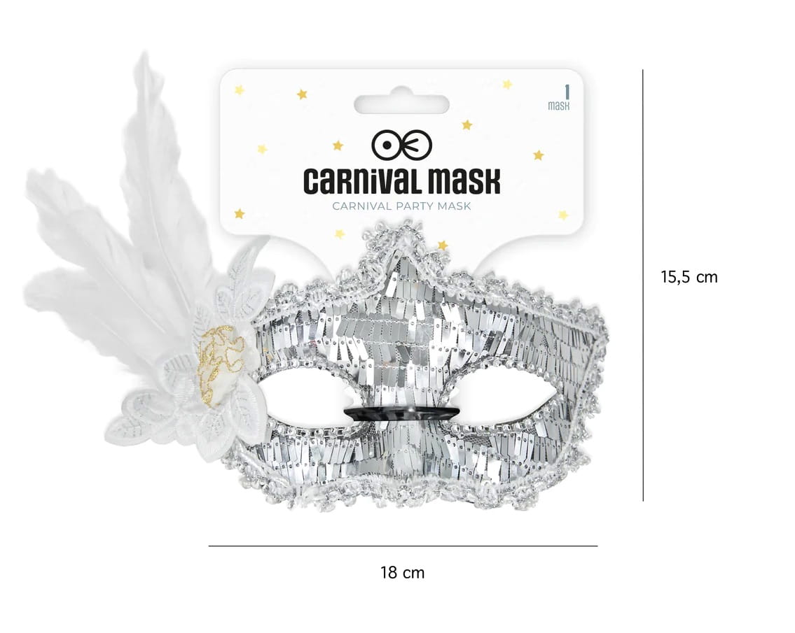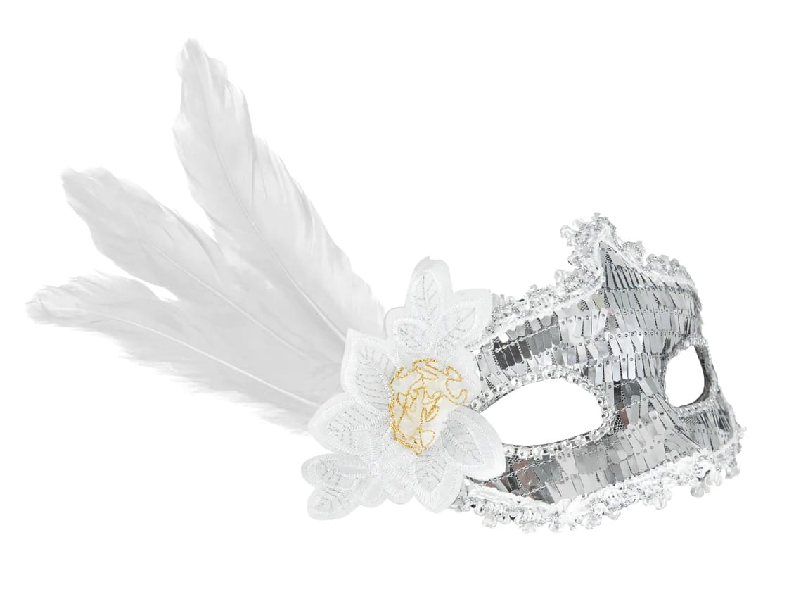Maska Wenecka KARNAWAŁOWA z piórami srebrna cekinowa DAMSKA
