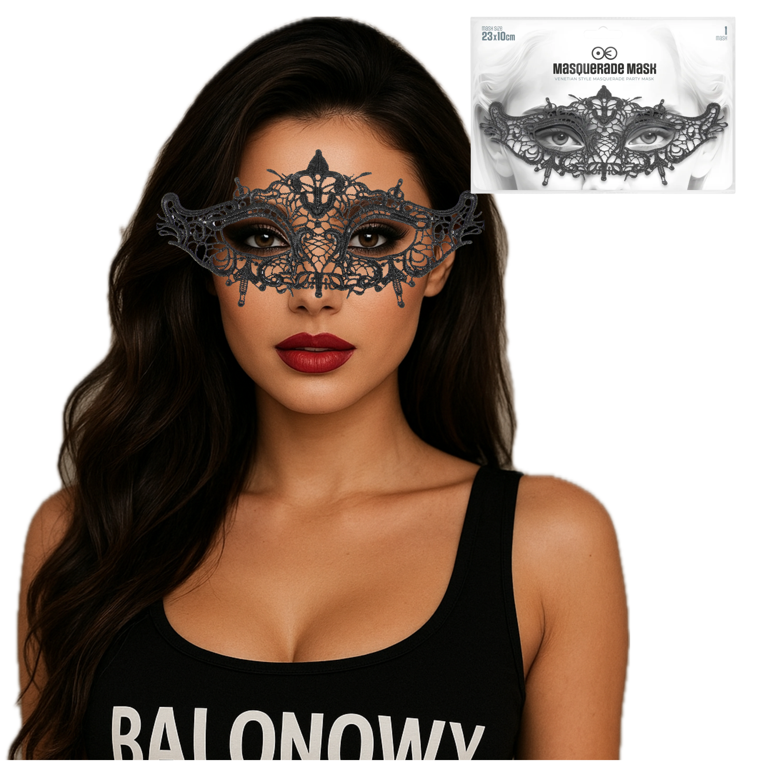 Stylowa, tajemnicza i niezwykle elegancka – ta czarna maska wenecka to doskonały dodatek do każdej karnawałowej kreacji, balu maskowego czy imprezy tematycznej. Wykonana z delikatnej koronki, subtelnie podkreśli rysy twarzy, dodając nuty tajemniczości i klasy.