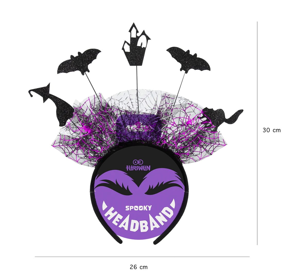 To opaska dla królowej Halloween! Ozdoba z czarnego tiulu pokrytego fioletowo-srebrnymi pajęczynami zwieńczona jest popularnymi w Halloween symbolami.