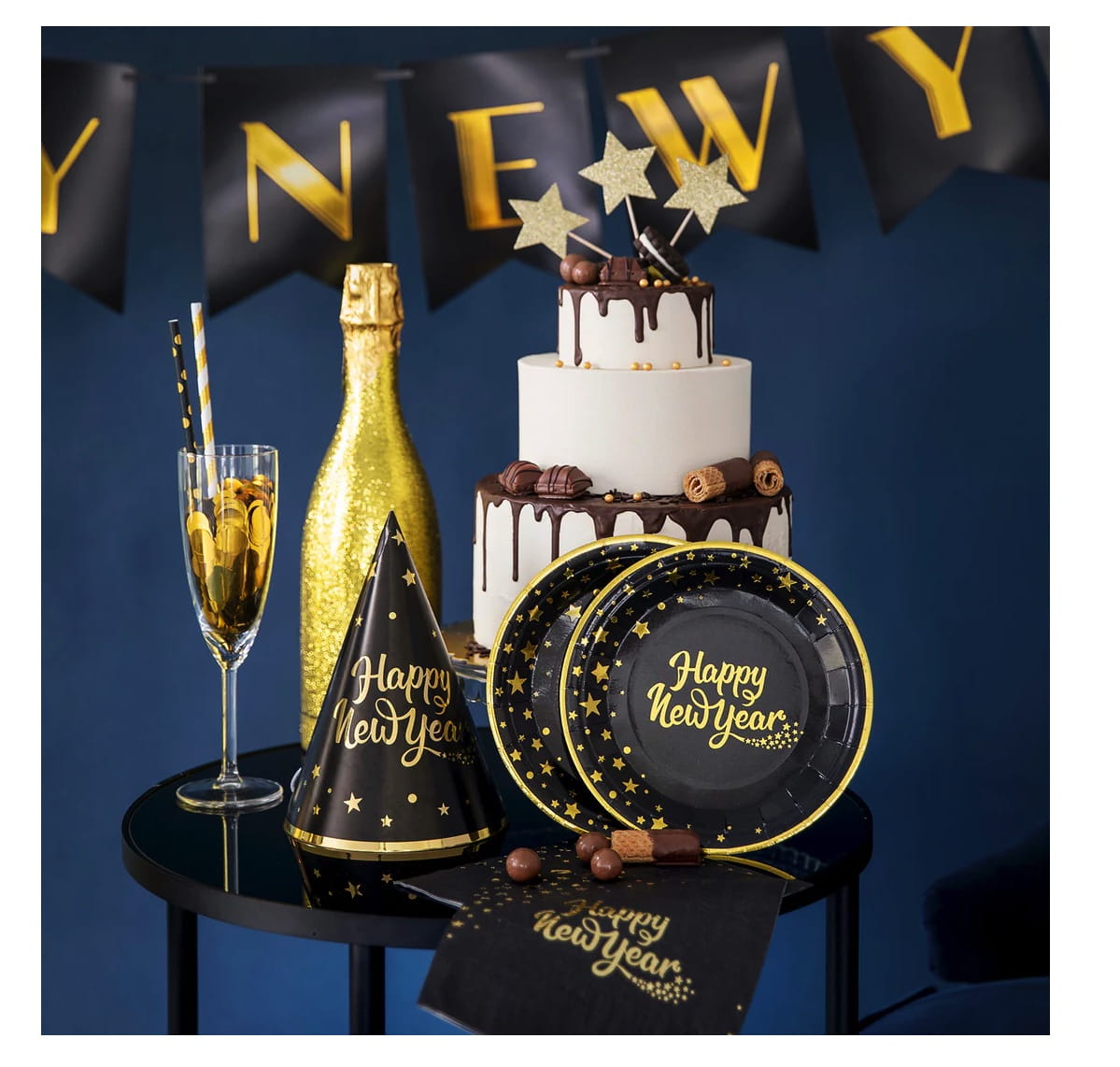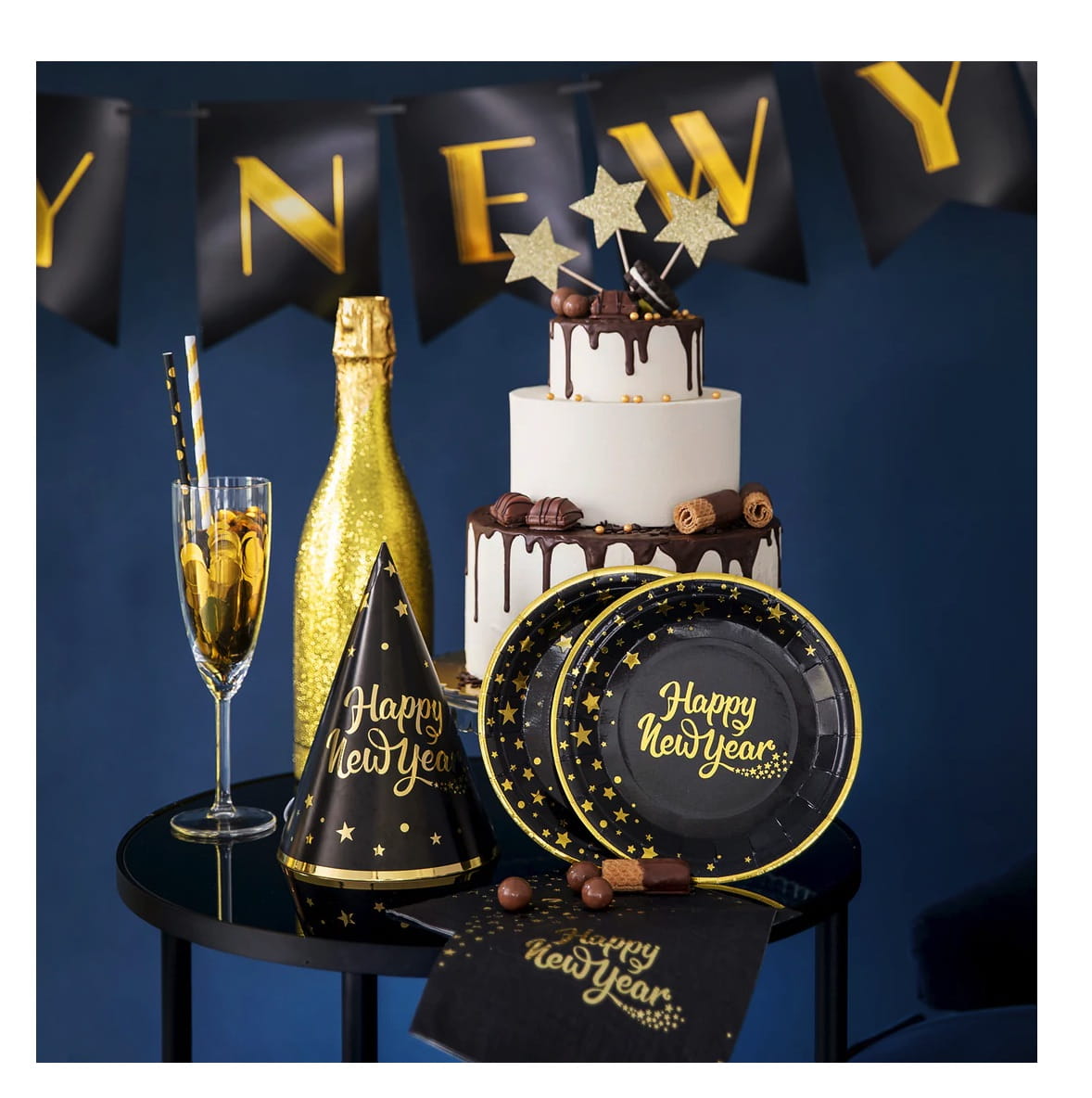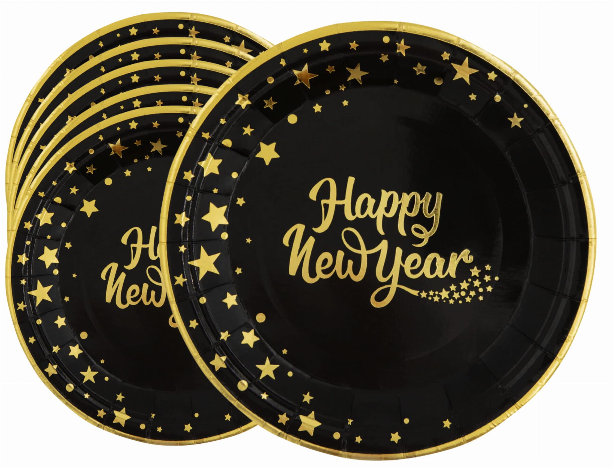 Czarny talerz ze złotą oblamówką, złotymi gwiazdkami i kropkami na części obwodu oraz z napisem Happy New Year. Idealny na imprezę sylwestrową - elegancki i wystrzałowy.