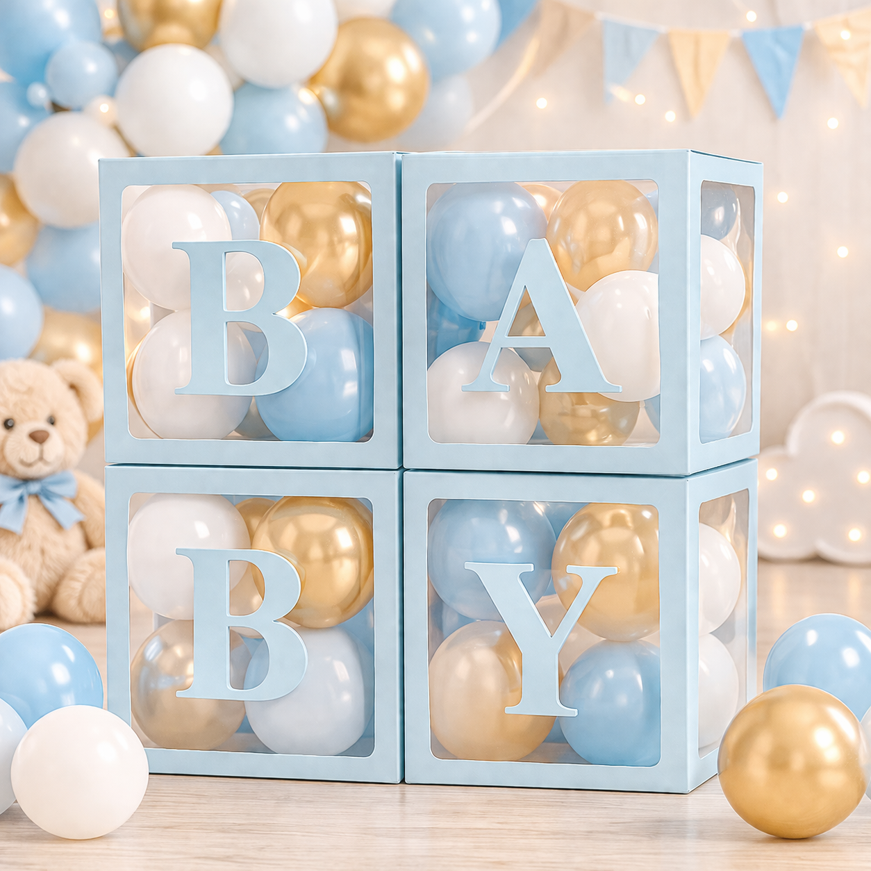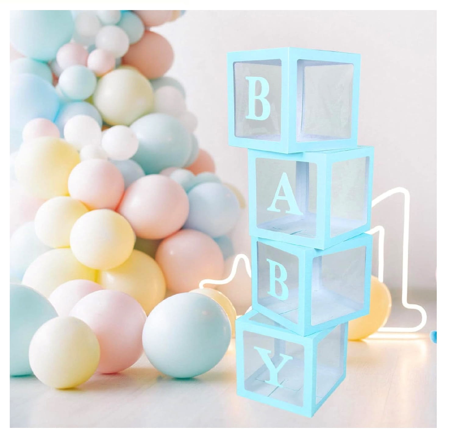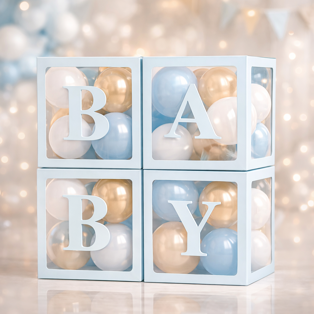 ⭐️ Baby Shower – wypełnij pudełka balonami w pastelowych kolorach, tworząc piękną dekorację na przyjęcie przyszłej mamy.