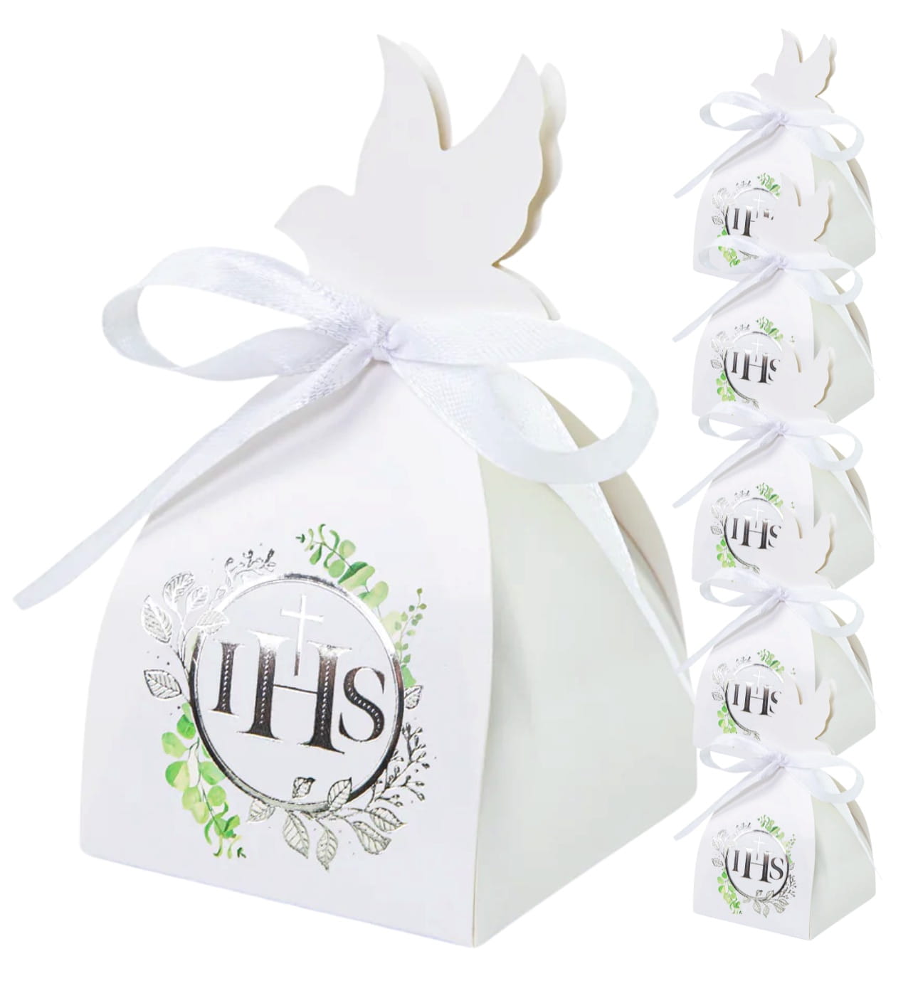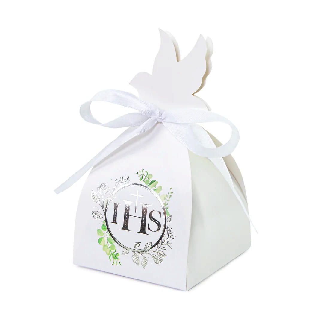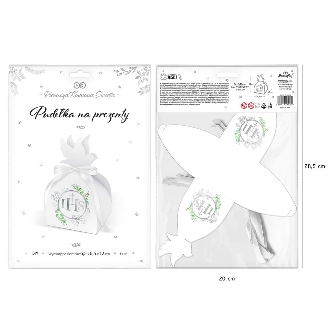 Pudełka na podziękowania prezent dla gości IHS Eukaliptus srebrny Komunia Święta 6szt. DIY