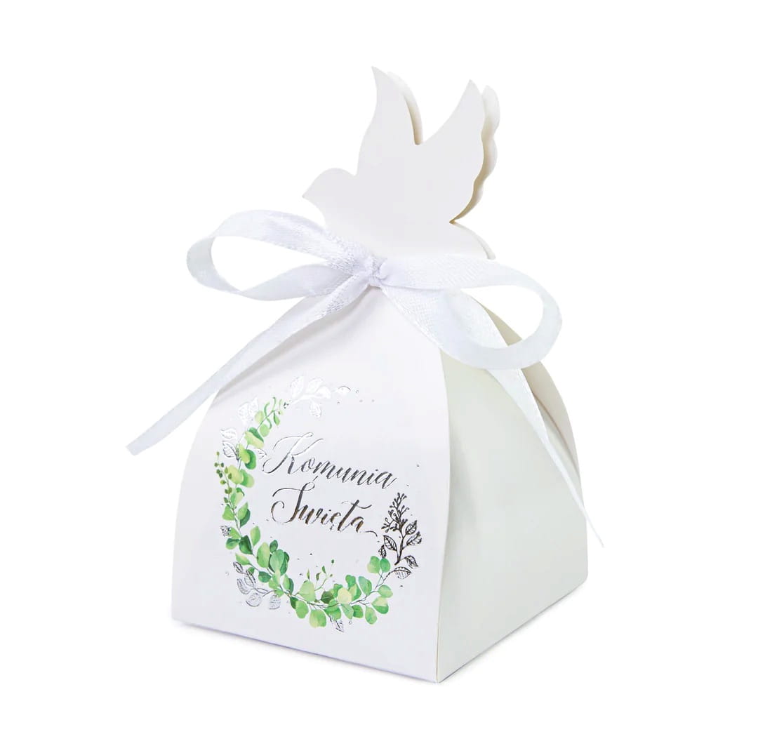 ⭐️ Na dwóch ściankach białego pudełka na upominki, umieszczono srebrny napis Komunia Święta oraz eukaliptus.
