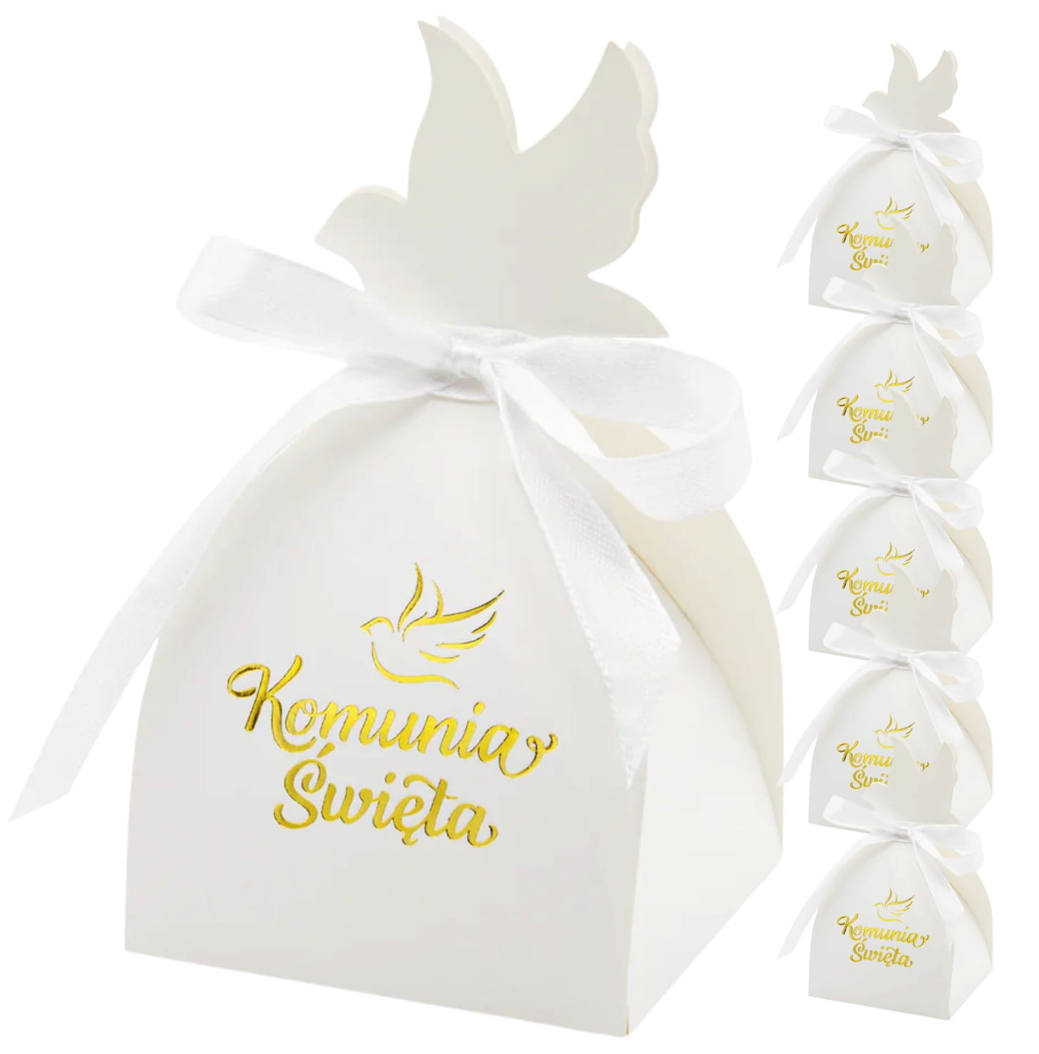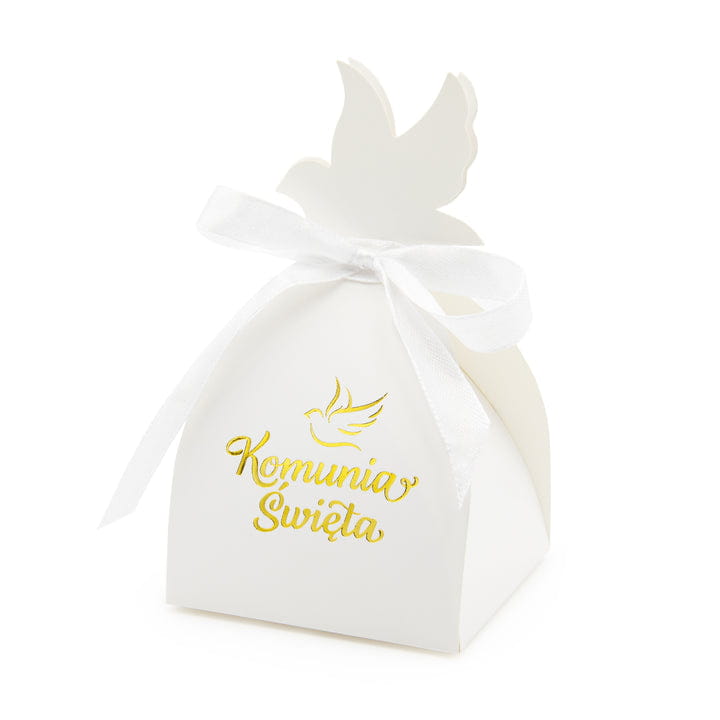 ⭐️ Na dwóch ściankach białego pudełka na upominki, umieszczono złoty napis Komunia Święta oraz gołąbka.