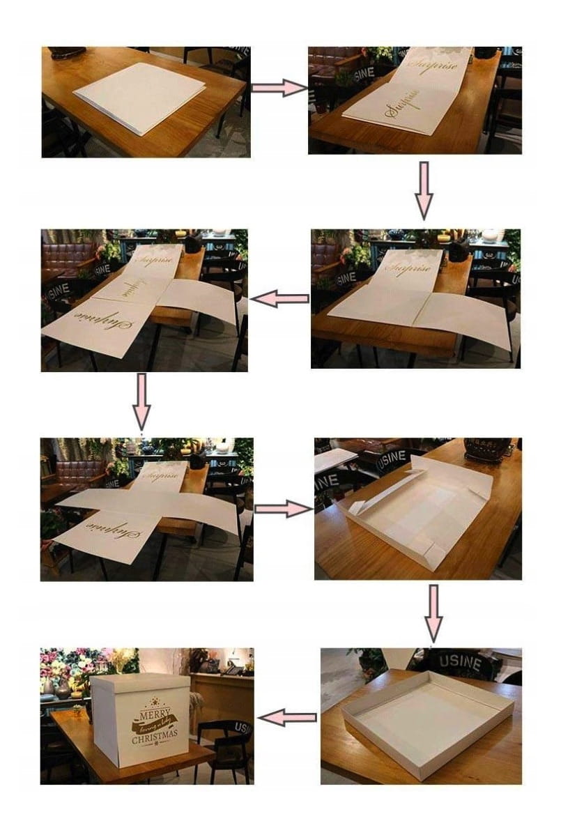 Po złożeniu kartonika i zdjęciu pokrywki, boki kartonu opadną odsłaniając znajdującą się w środku niespodziankę. Idealne do wypełnienia małymi balonami, bukietu z kwiatami lub do wręczenia tradycyjnego prezentu. Pudełko wykonane papieru, do samodzielnego złożenia.
