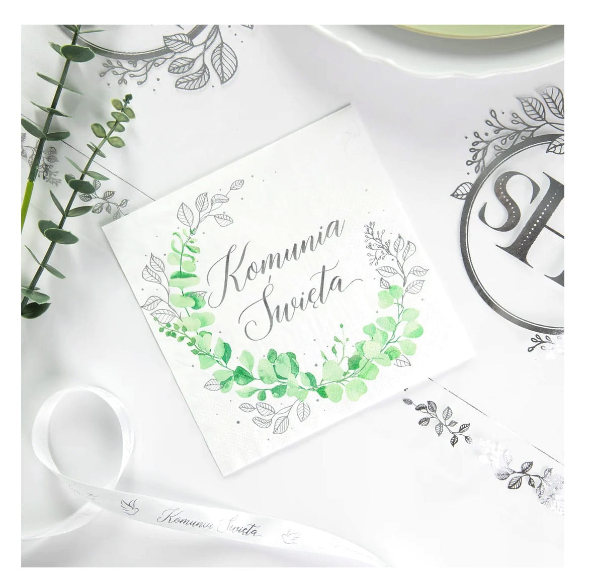 Serwetki papierowe komunijne Komunia Święta Eukaliptus srebrny 10szt