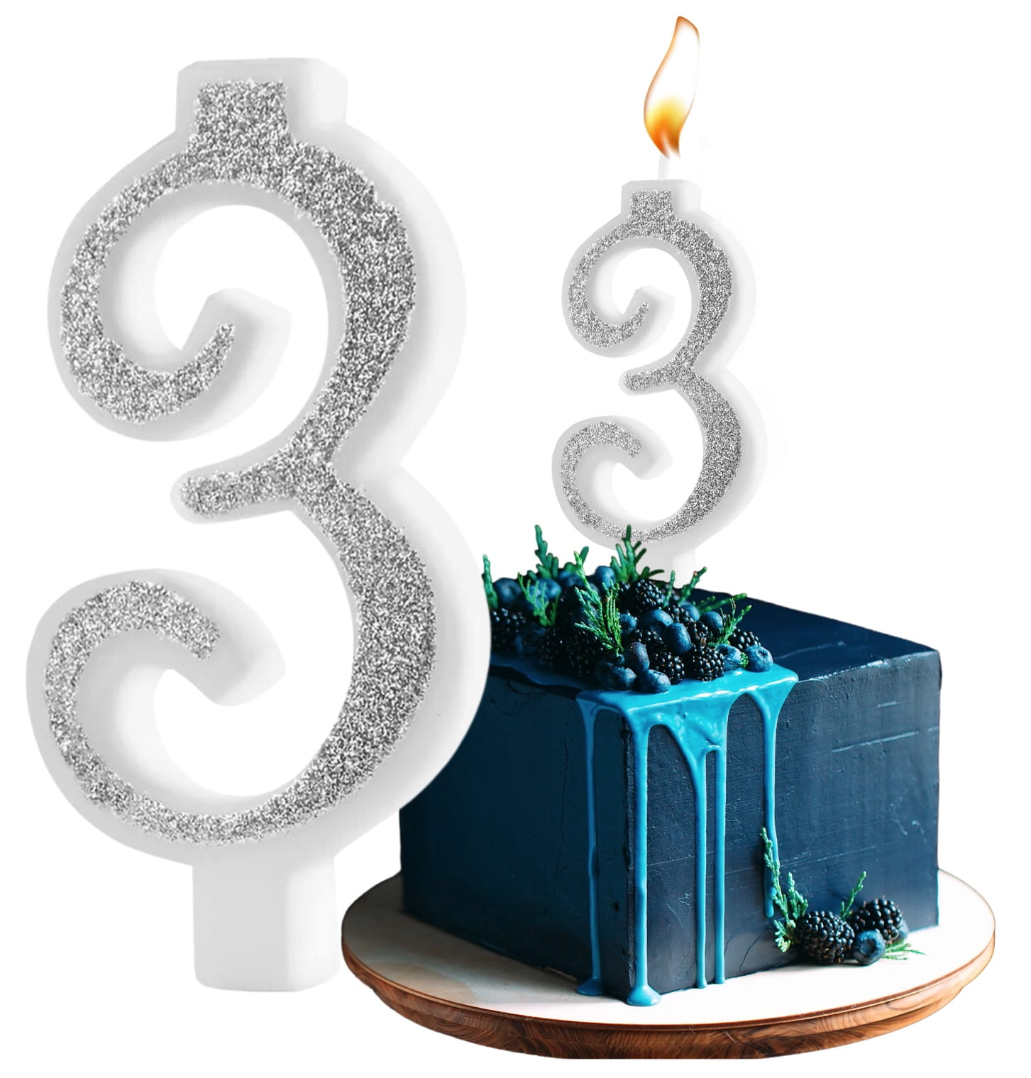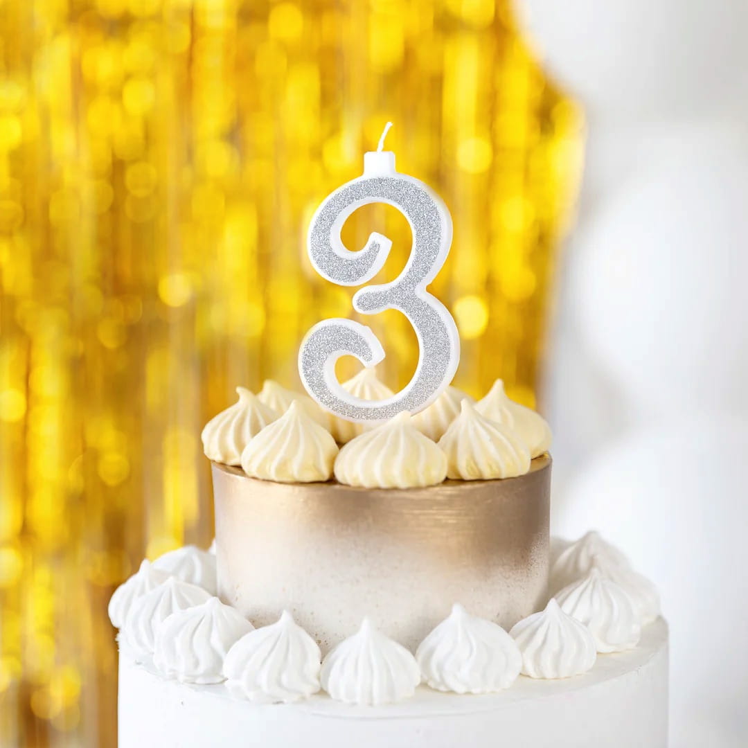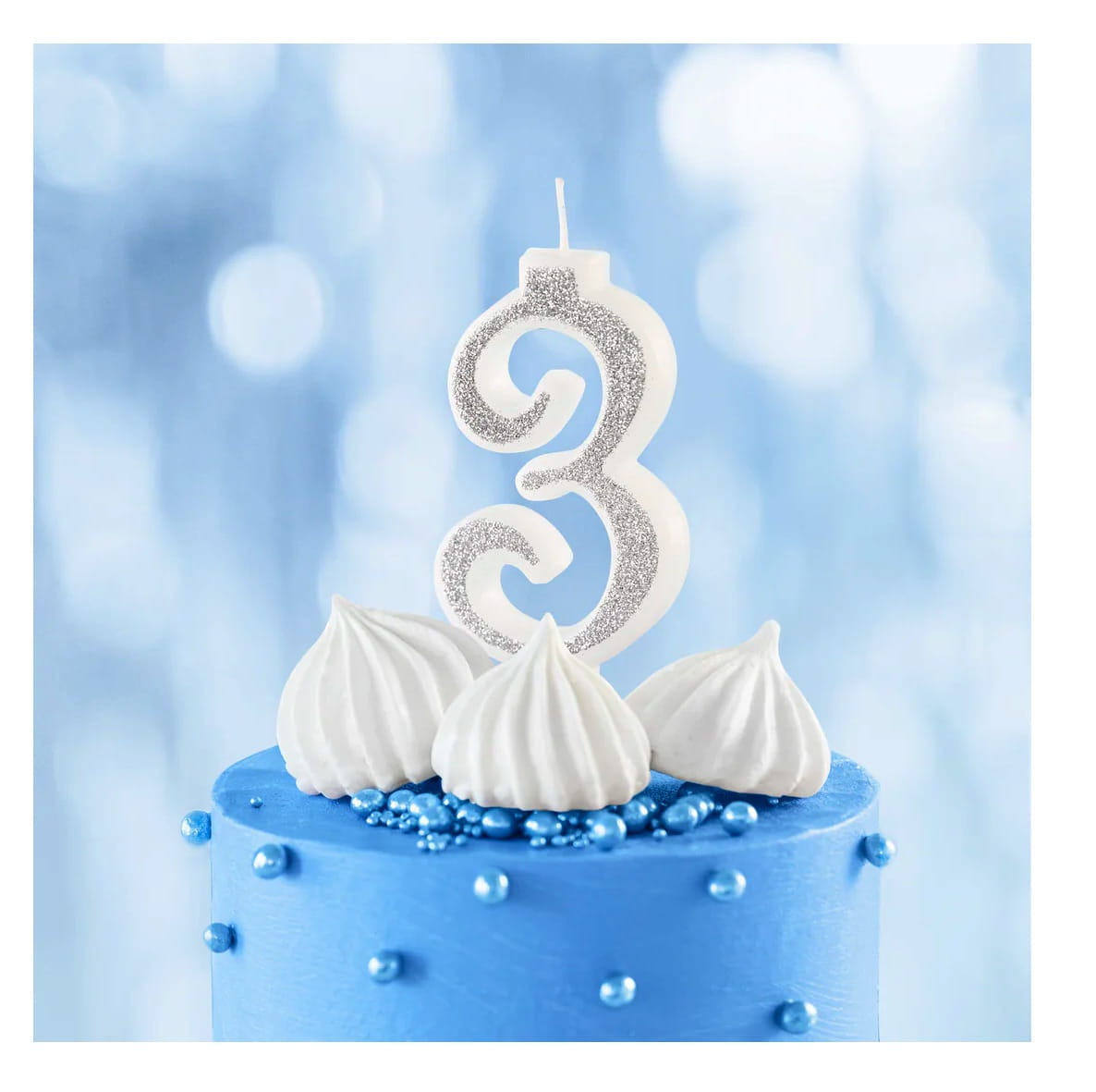 Świeczka na tort - Cyfra 3, srebrna Brokatowa
