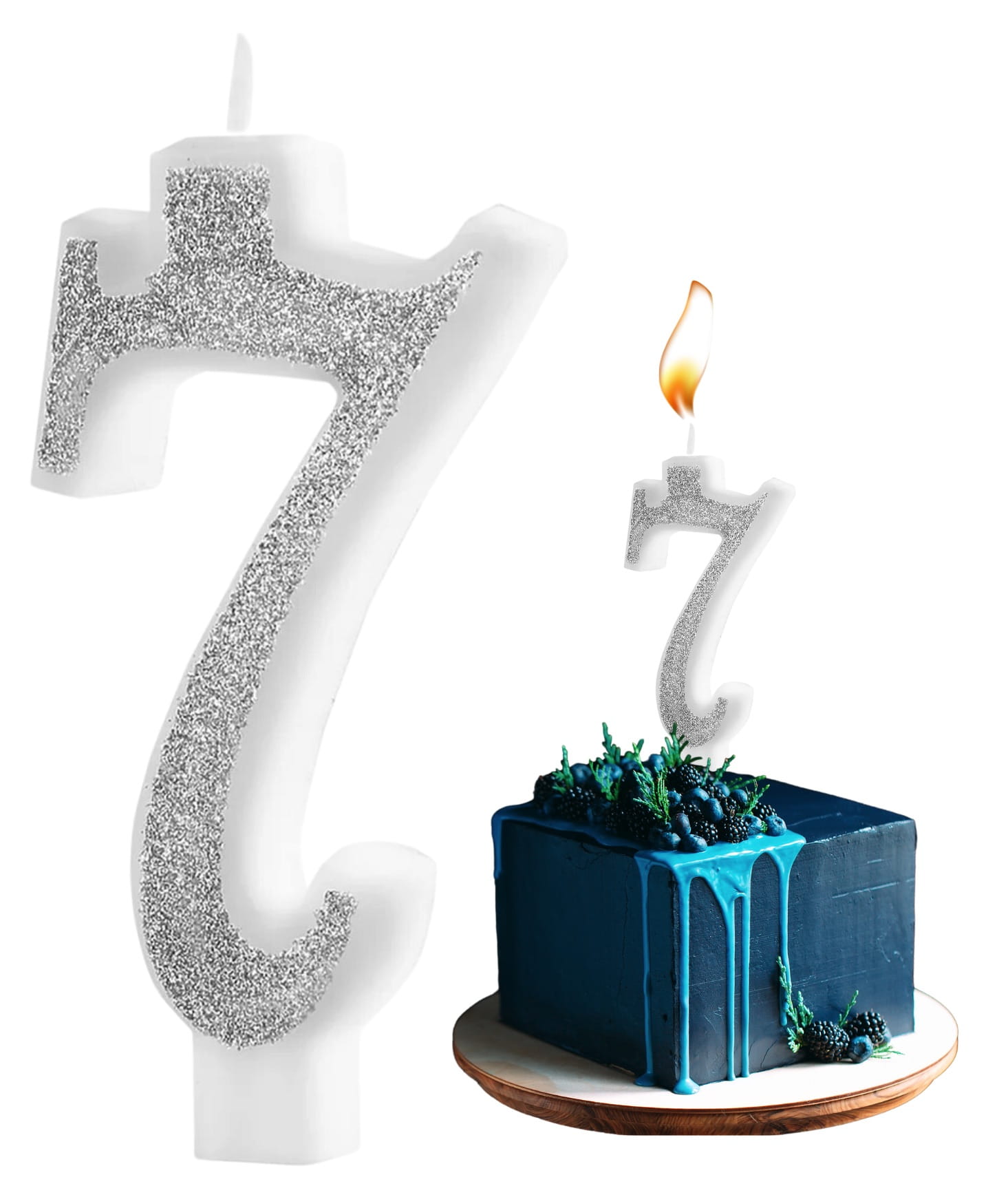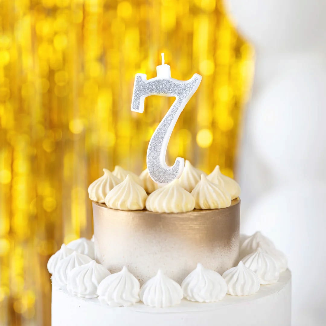 Świeczka na tort - Cyfra 7, srebrna Brokatowa