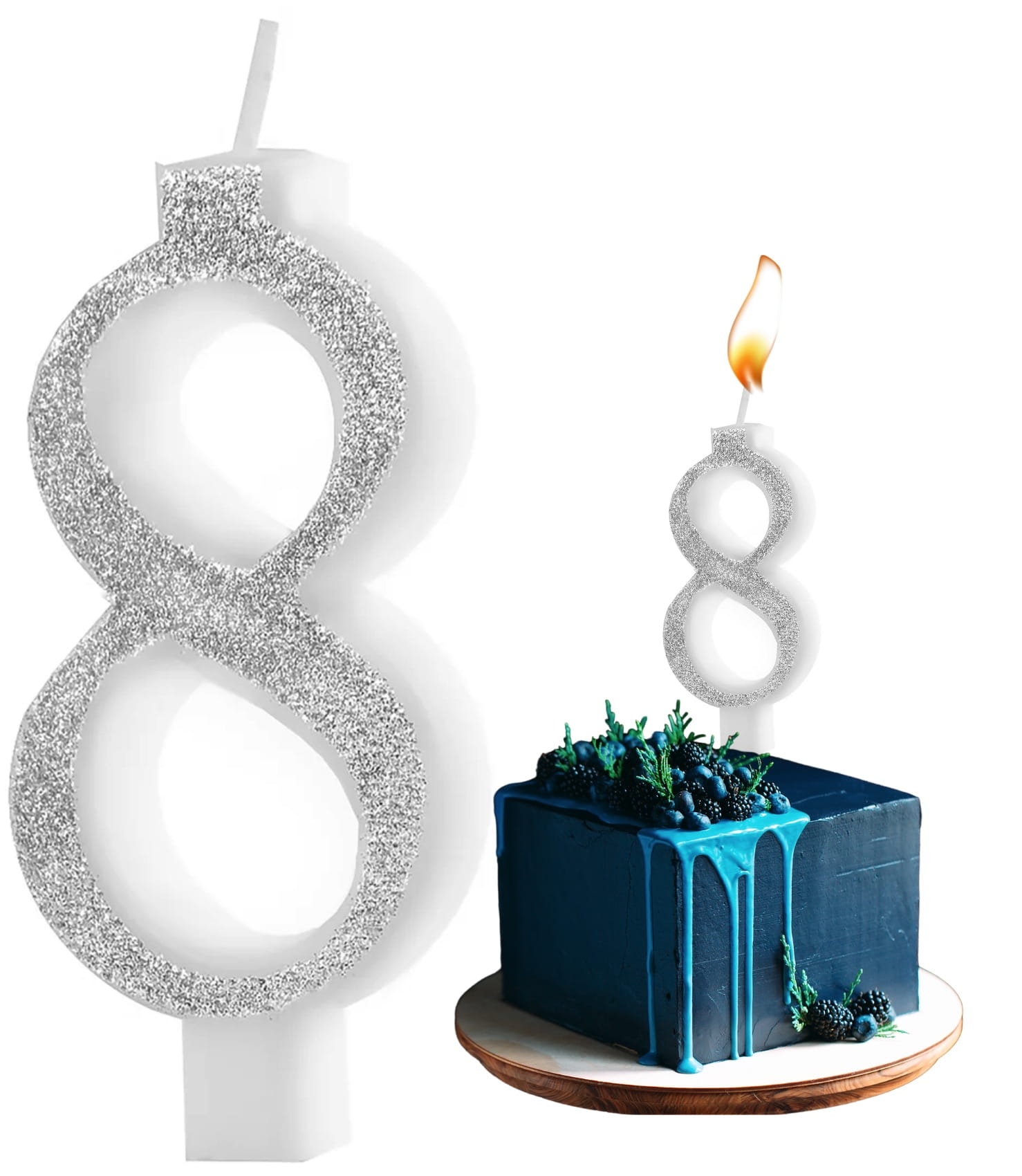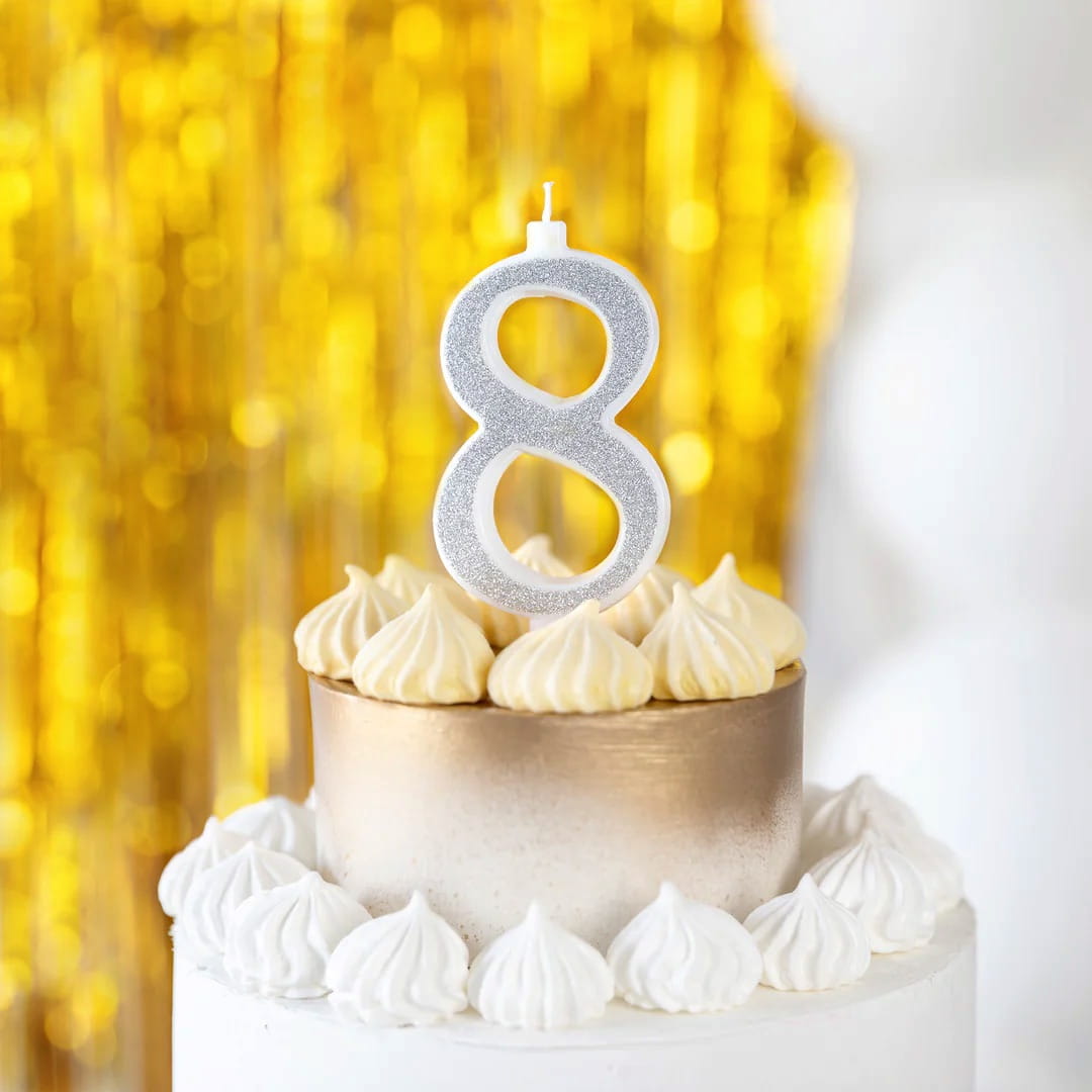 Świeczka na tort - Cyfra 8, srebrna Brokatowa