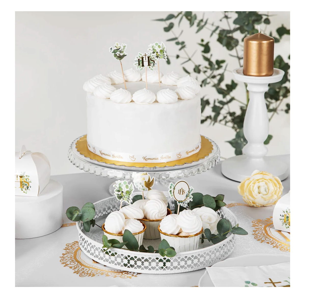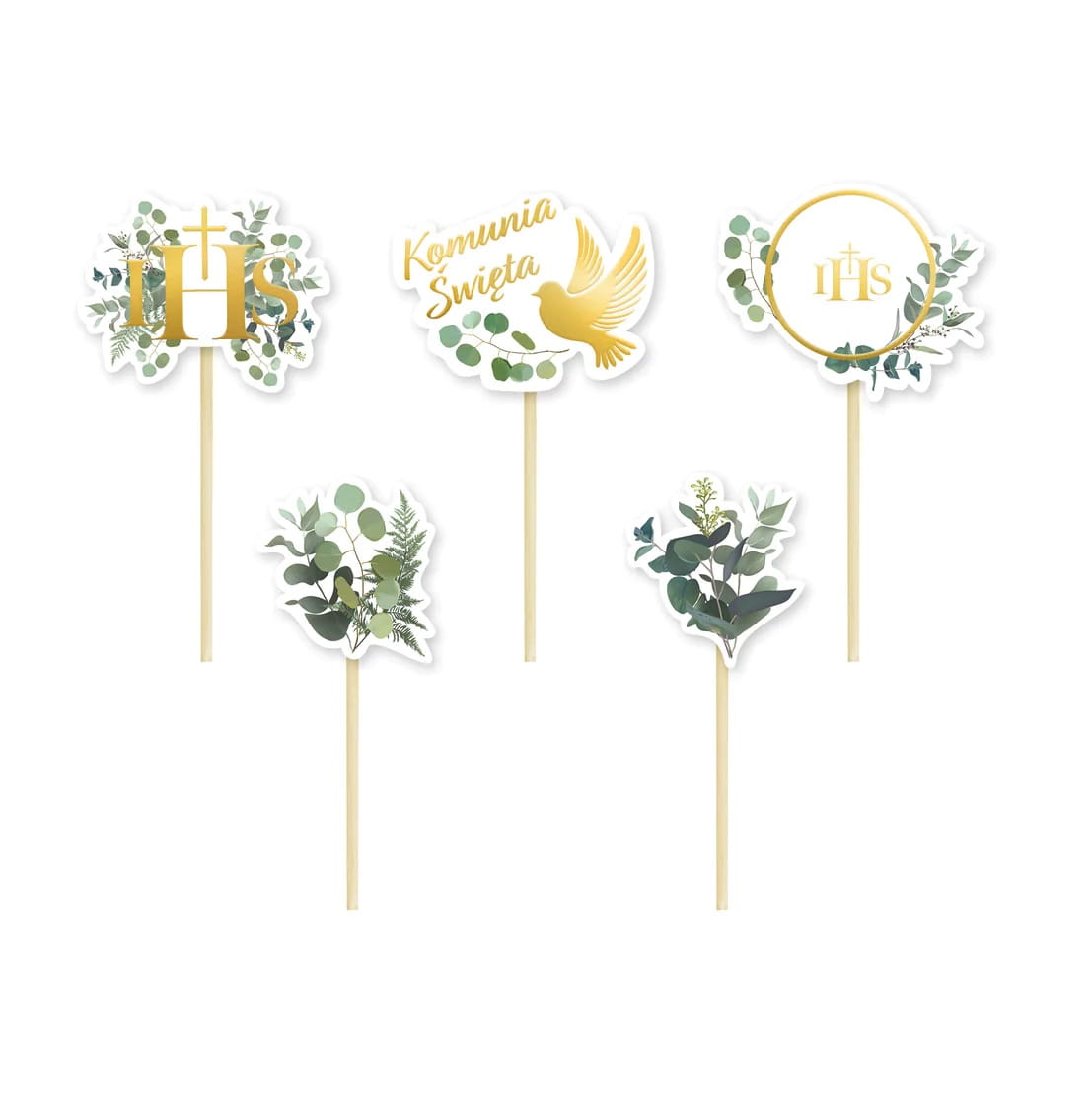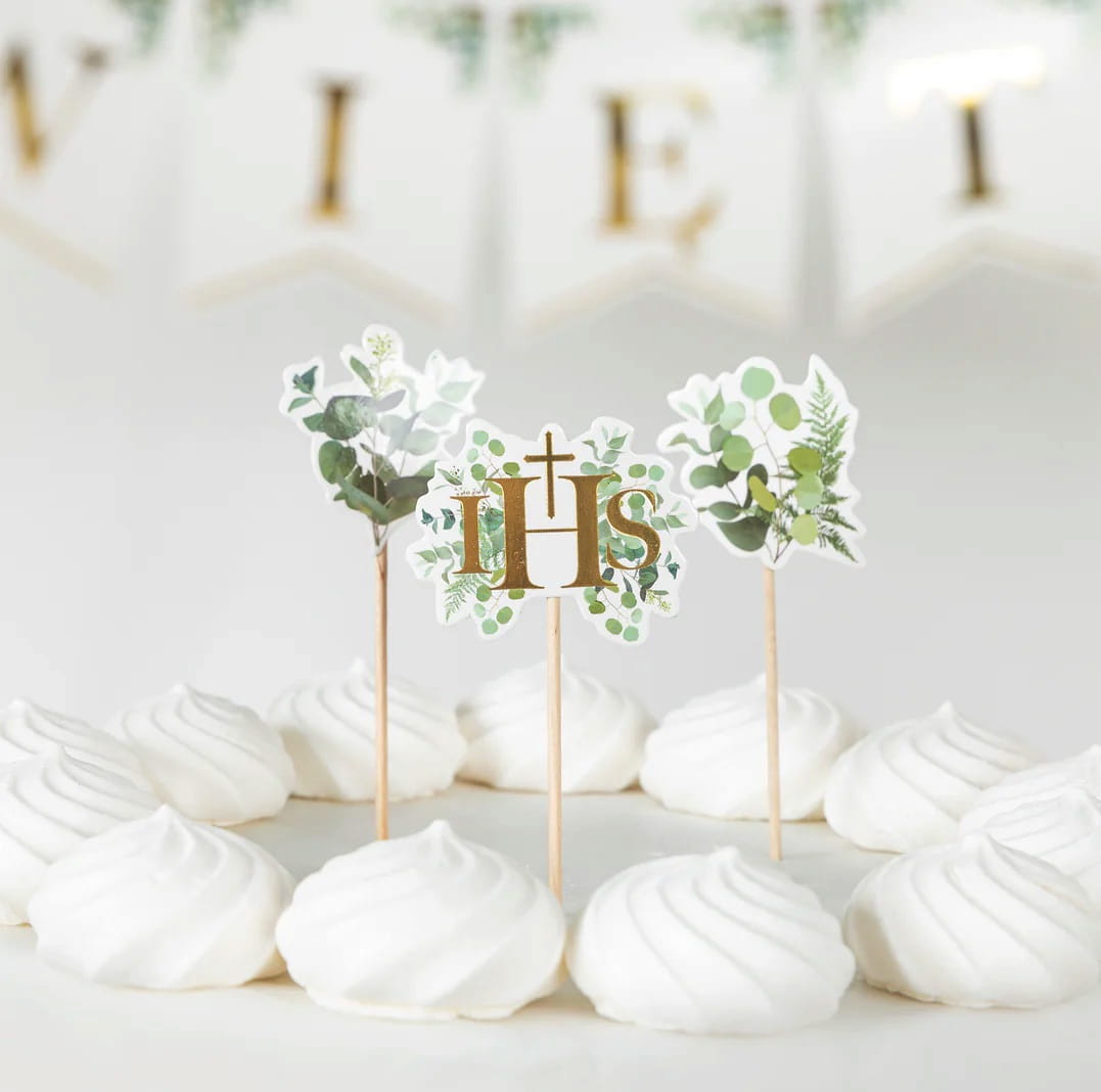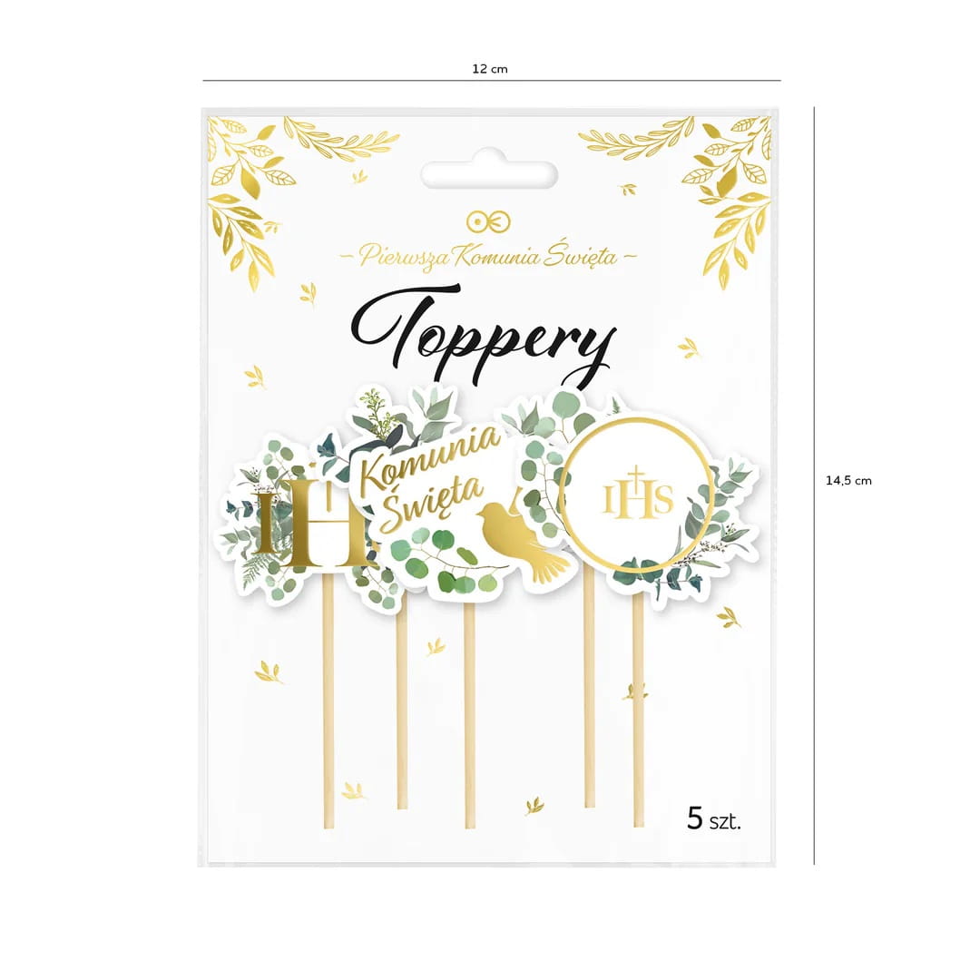 Toppery na tort z zielonymi gałązkami eukaliptusa. W zestawie znajdują się 3 toppery ze złotymi napisami: dwa z napisem IHS, w tym jeden w kształcie hostii oraz jeden z napisem Komunia Święta i z gołąbkiem.