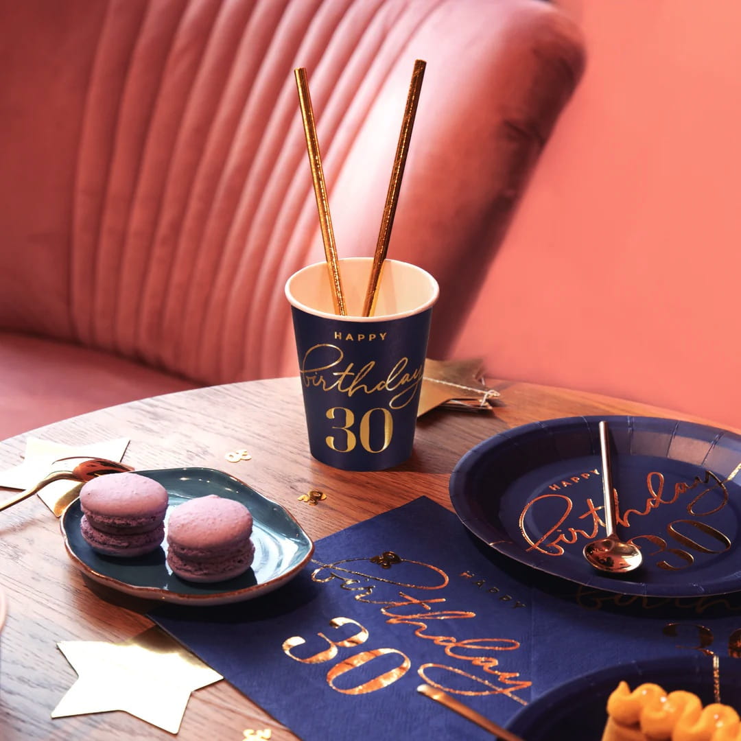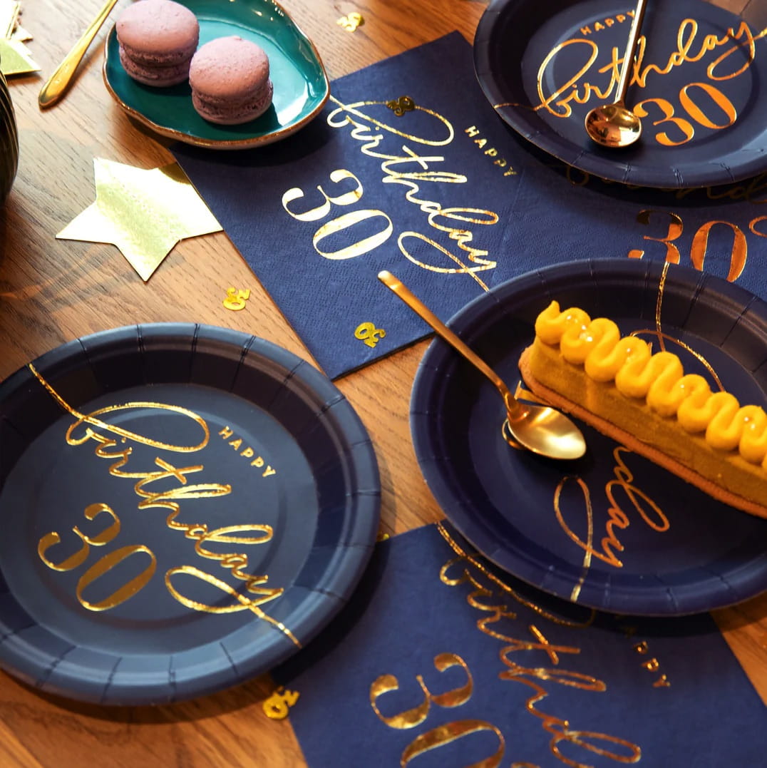 ⭐️ Stylowy design: Serwetki posiadają granatowy kolor z złotym nadrukiem "Happy Birthday 30", co nadaje im elegancki wygląd i dodaje uroku każdemu przyjęciu urodzinowemu.