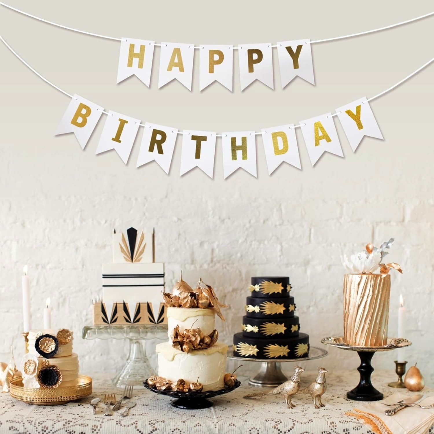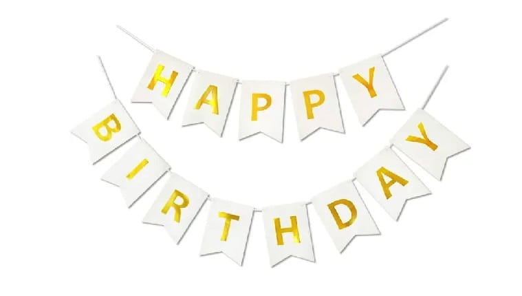 ✔️ Baner urodzinowy napis "Happy Birthday" złoty na białym tle (papierowa, jednostronna girlanda z 13 flag, 16x20x190 cm)