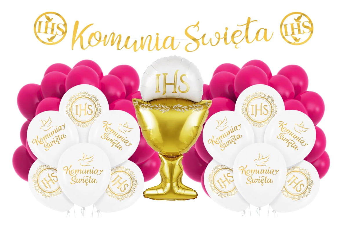 Zestaw Balonów na Komunię Świętą fuksja IHS opłatek