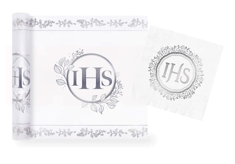 Zestaw na Komunię Świętą serwetki i bieżnik z organzy IHS biało srebrny