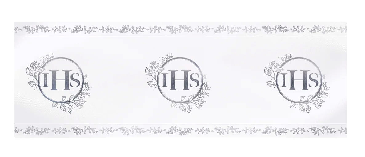 Bieżnik na komunię z przejrzystej organzy ze srebrnymi wzorami. Głównym, powtarzającym się motywem jest hostia z napisem IHS otoczona delikatnymi, srebrnymi listkami. Wzdłuż całej długości bieżnika komunijnego znajdują się dwa szlaczki, również z motywem listków. Całość prezentuje się wyśmienicie.