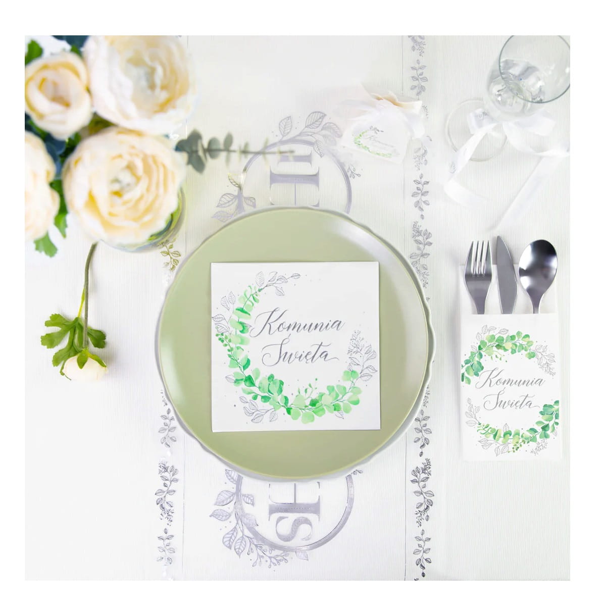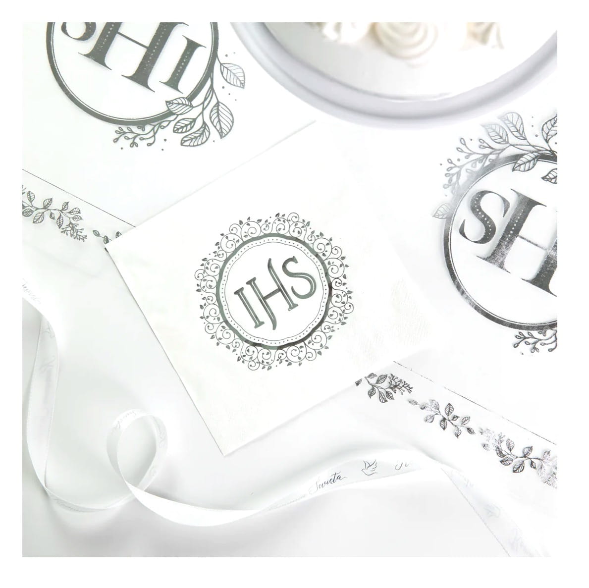 Białe serwetki komunijne ze srebrnym motywem hostii, będą praktycznym i eleganckim dodatkiem do uroczystej zastawy stołowej. Idealna serwetka dla osób, które wolą odejść od tradycyjnego złotego koloru na przyjęciach komunijnych.