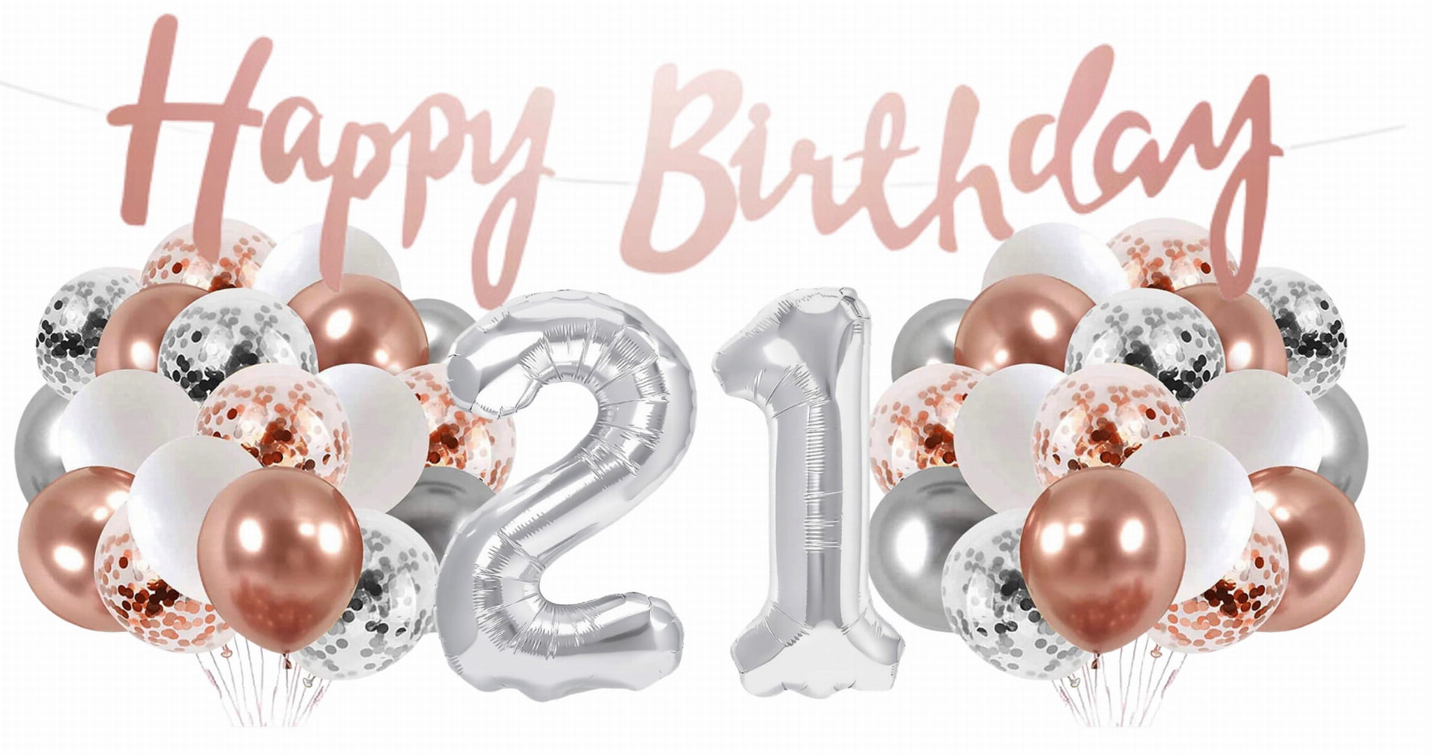 Zestaw balonów 21 urodziny Rose gold srebrne Baner Happy Birthday Balony