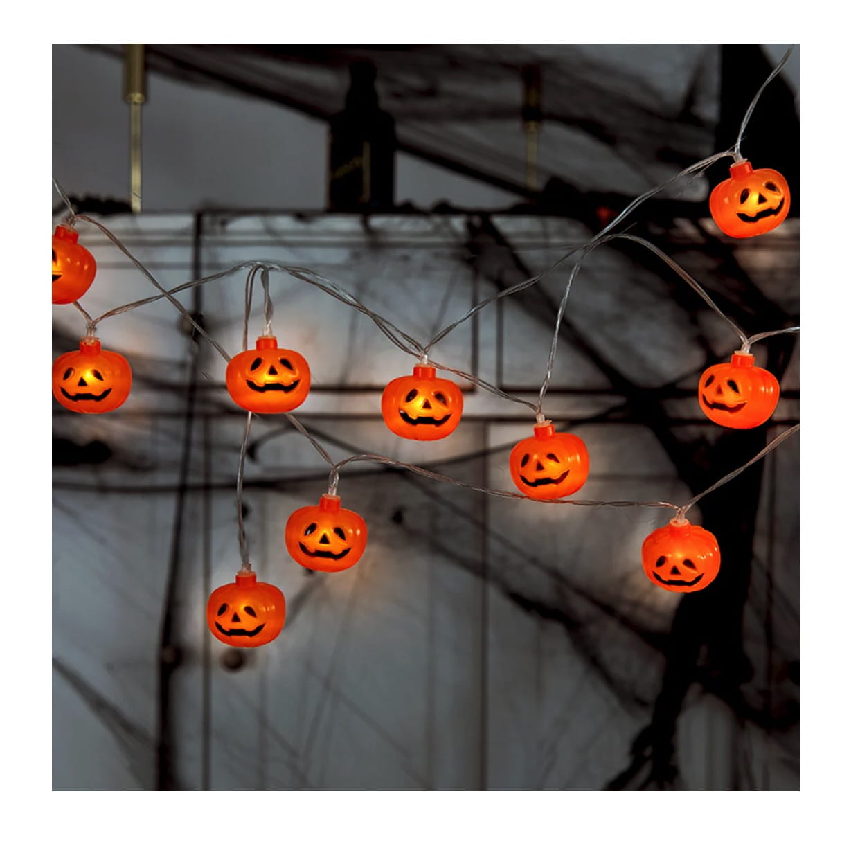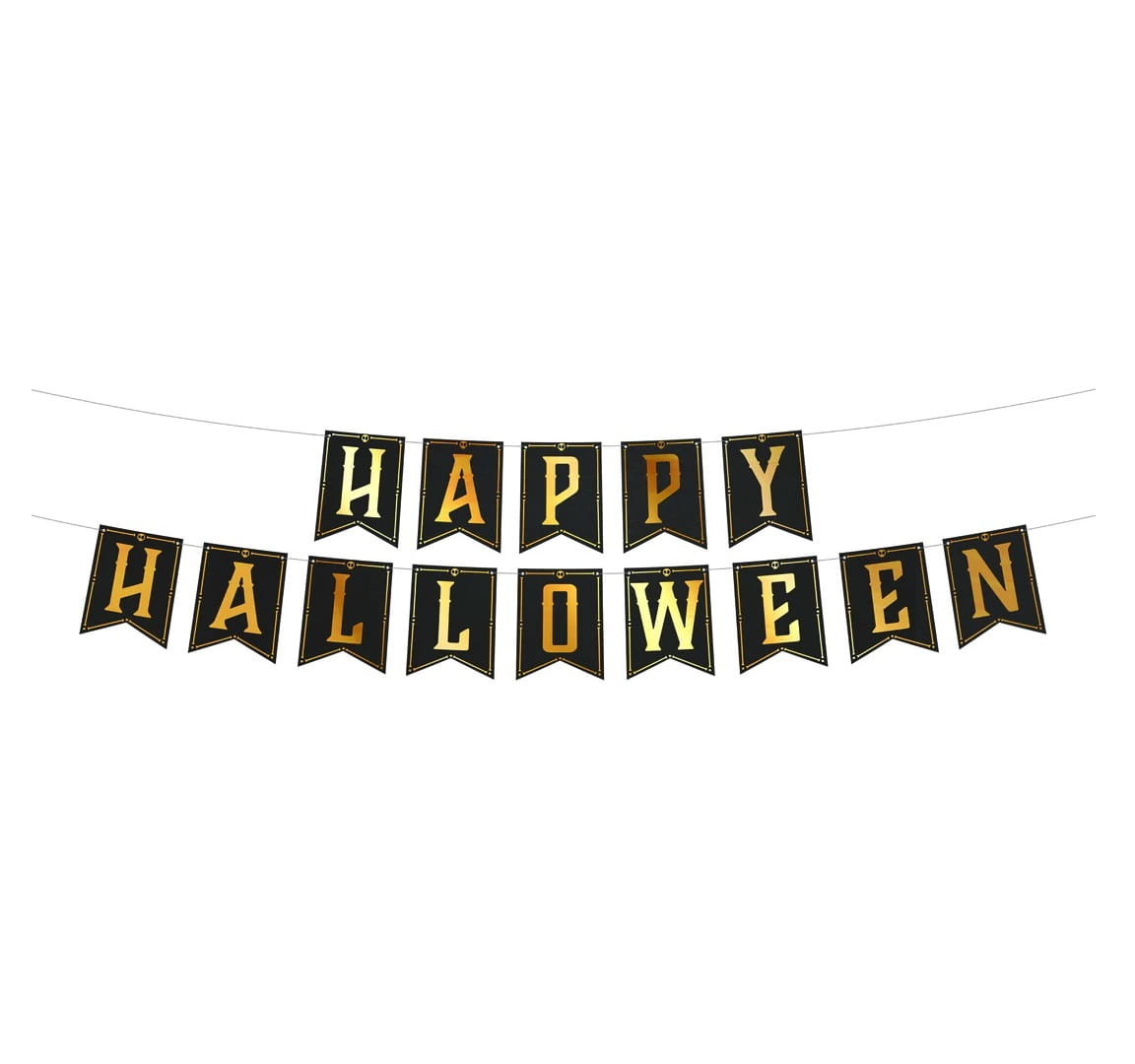 ✔️ baner Happy Halloween (girlanda z 14 flag, czarne flagi ze złotą obwódkę z kości piszczelowych i czaszki na szczycie, 14,4x20x250 cm)