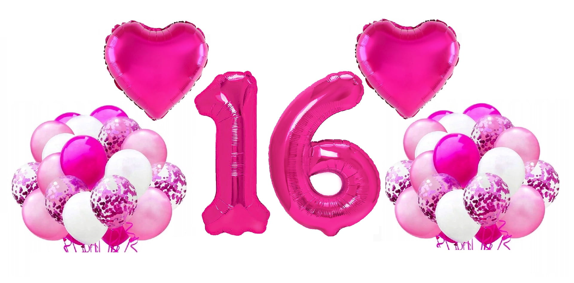 Zestaw balonów na 16 Urodziny Cyfry 100cm fuksja Serce balony