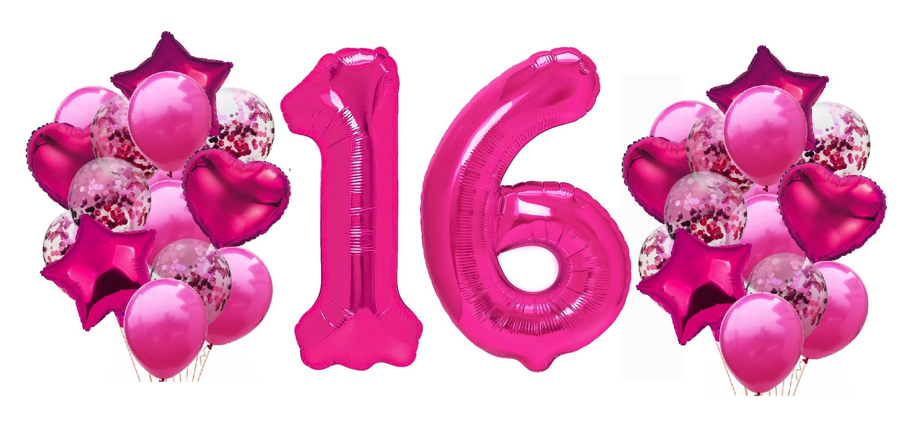 Zestaw balonów na 16 Urodziny Cyfry fuksja balony z konfetti