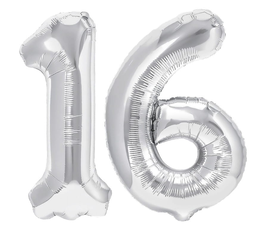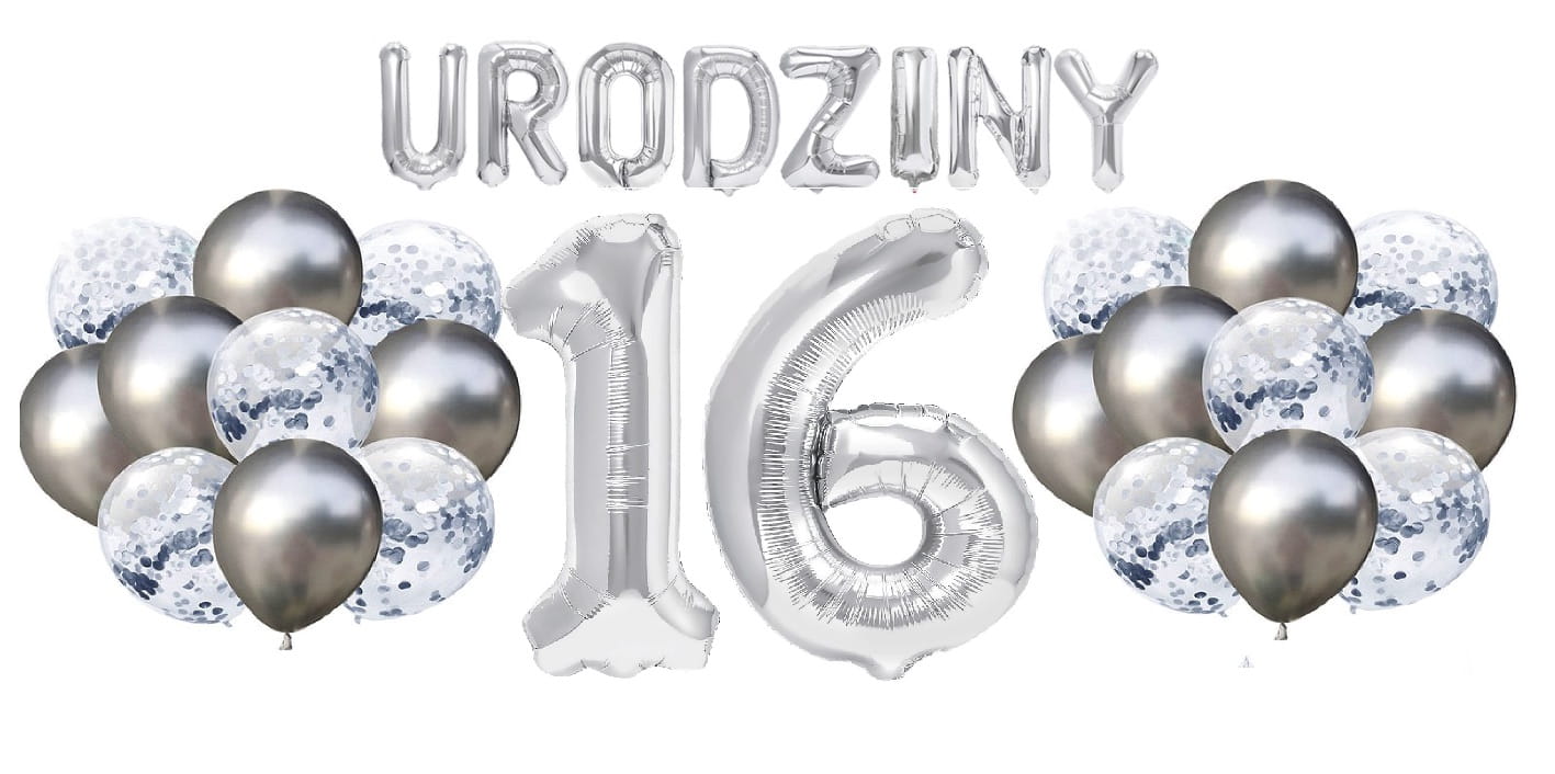 Zestaw balonów na 16 Urodziny srebrne balony Napis