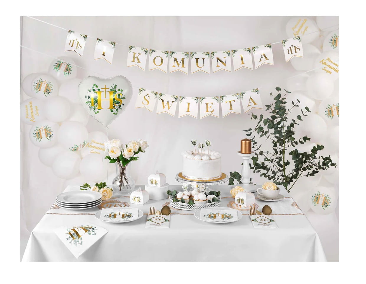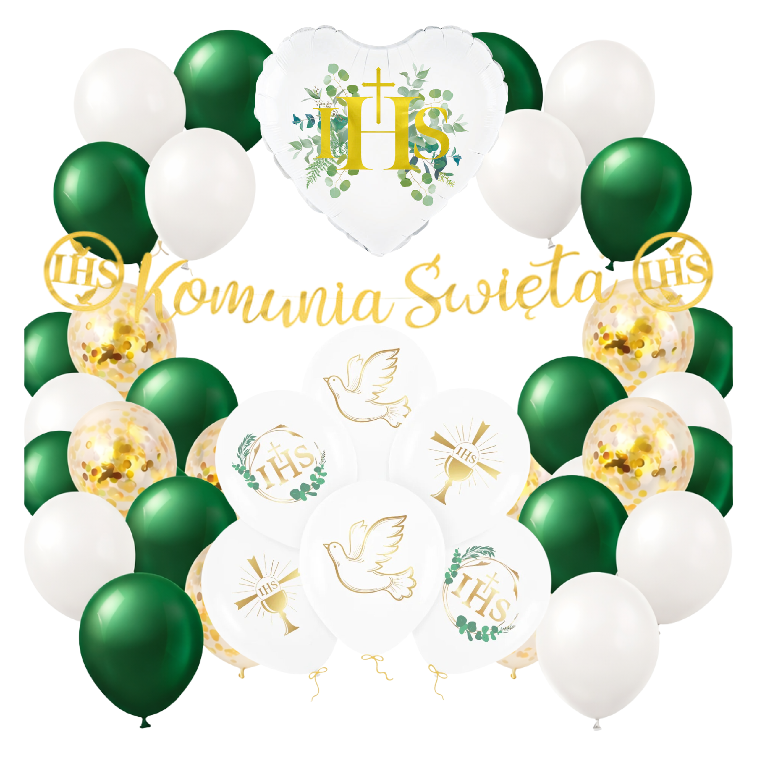 Zestaw balonów na I Komunię Świętą biało zielone Baner Girlanda złota IHS