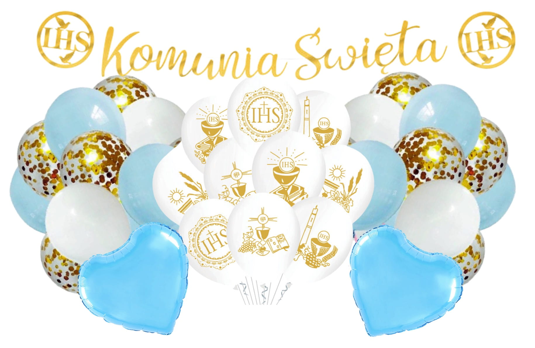 Zestaw balonów na Komunię błękit IHS dla Chłopca