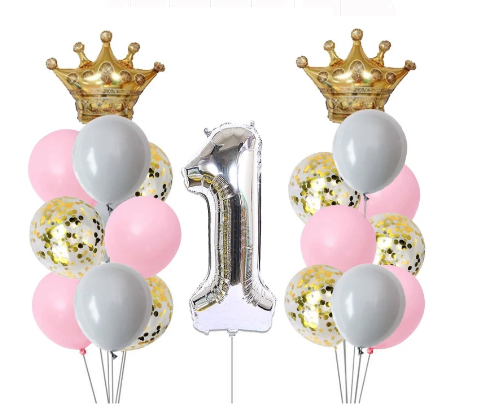 Zestaw balonów na Roczek dla dziewczynki z cyfrą srebrną