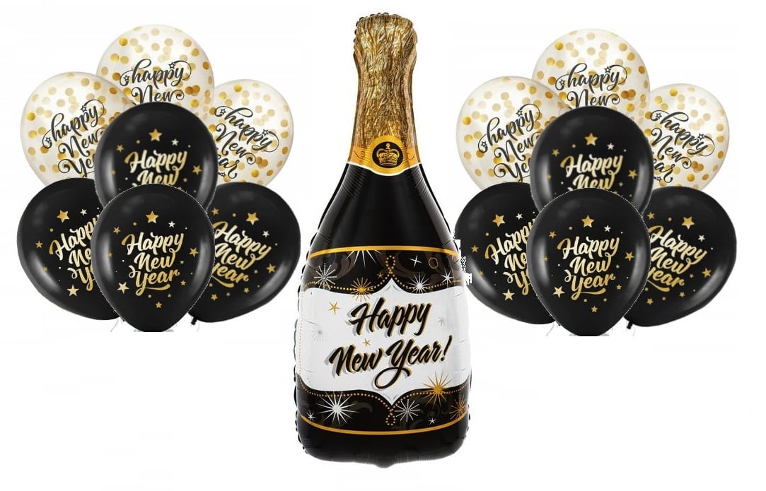 Zestaw balonów na Sylwestra czarno złote Happy New Year