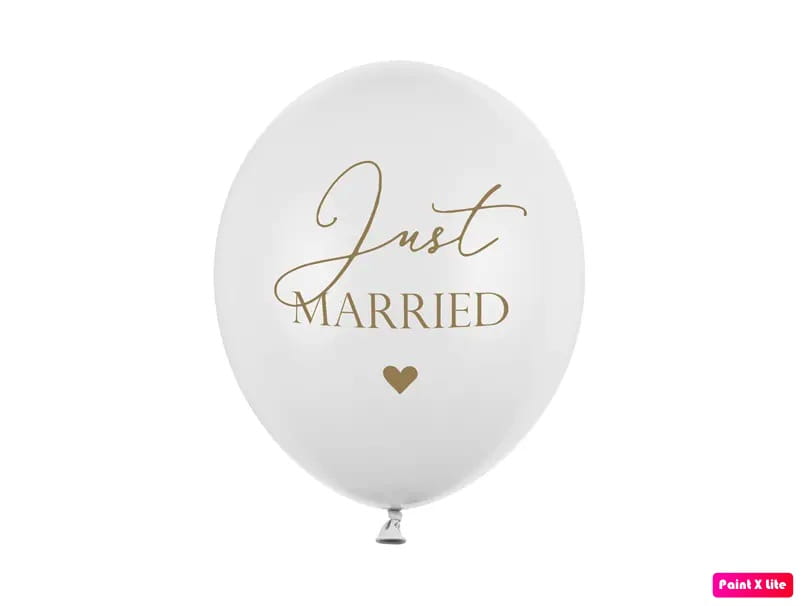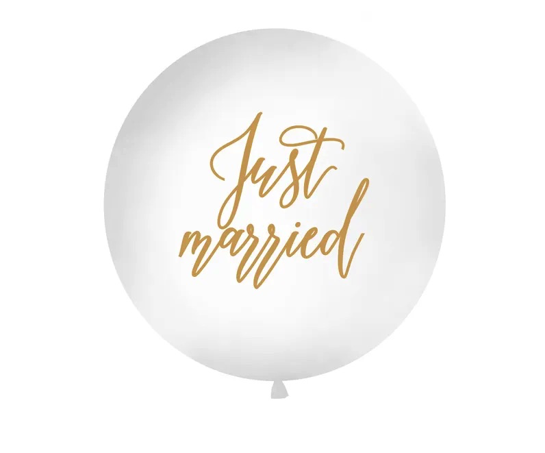 - balon lateksowy biały ze złotym nadrukiem Just Married 1 sztuka około 100 cm (1 metr)