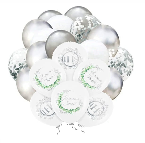 Zestaw balonów Komunijnych srebrne z nadrukiem IHS Komunia święta
