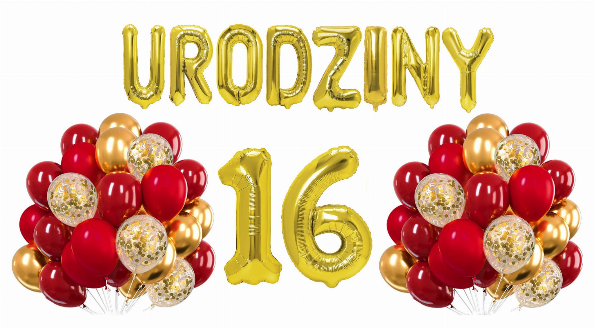 Zestaw balonów złoto czerwonych na 16 Urodziny Cyfry