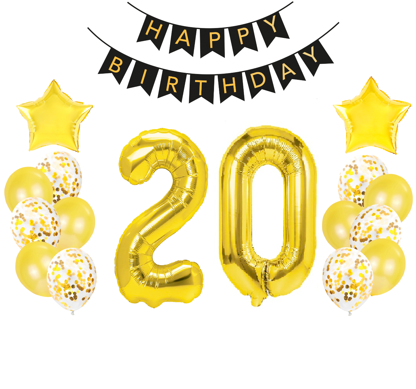 Zestaw balonów złotych na Urodziny z Banerem cyfry 20 70cm Dwudzieste