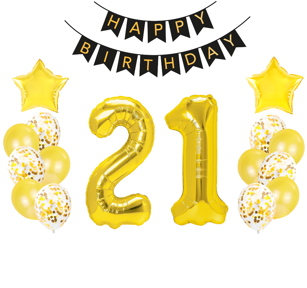 Zestaw balonów złotych na Urodziny z Banerem cyfry 21 70cm Dwudzieste