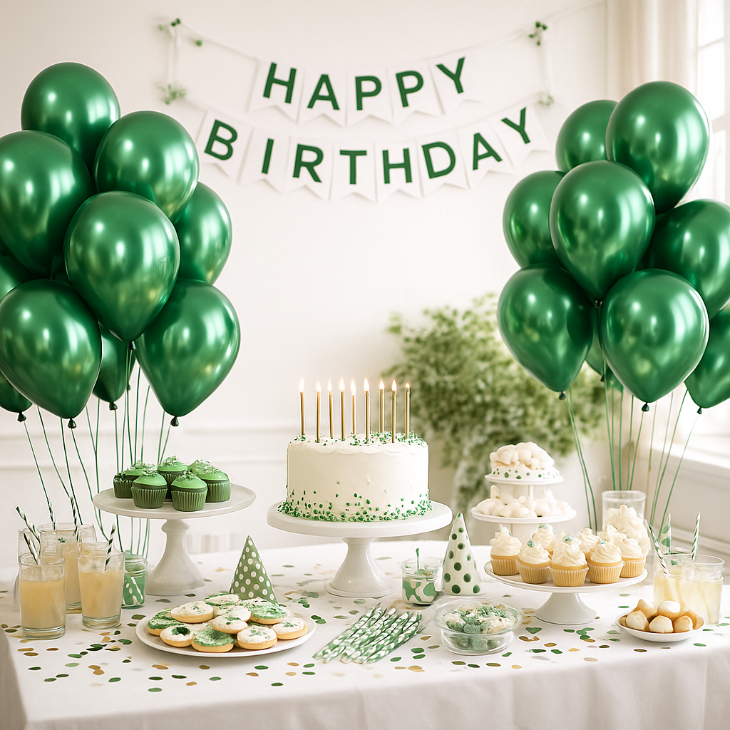 Połączenie butelkowej zieleni, bieli i złotego konfetti tworzy klasyczną, elegancką dekorację, idealną do domu, restauracji lub sali przyjęć. Baner Chrzest Święty z gołębiami pięknie uzupełnia całość i tworzy idealne tło do pamiątkowych zdjęć.